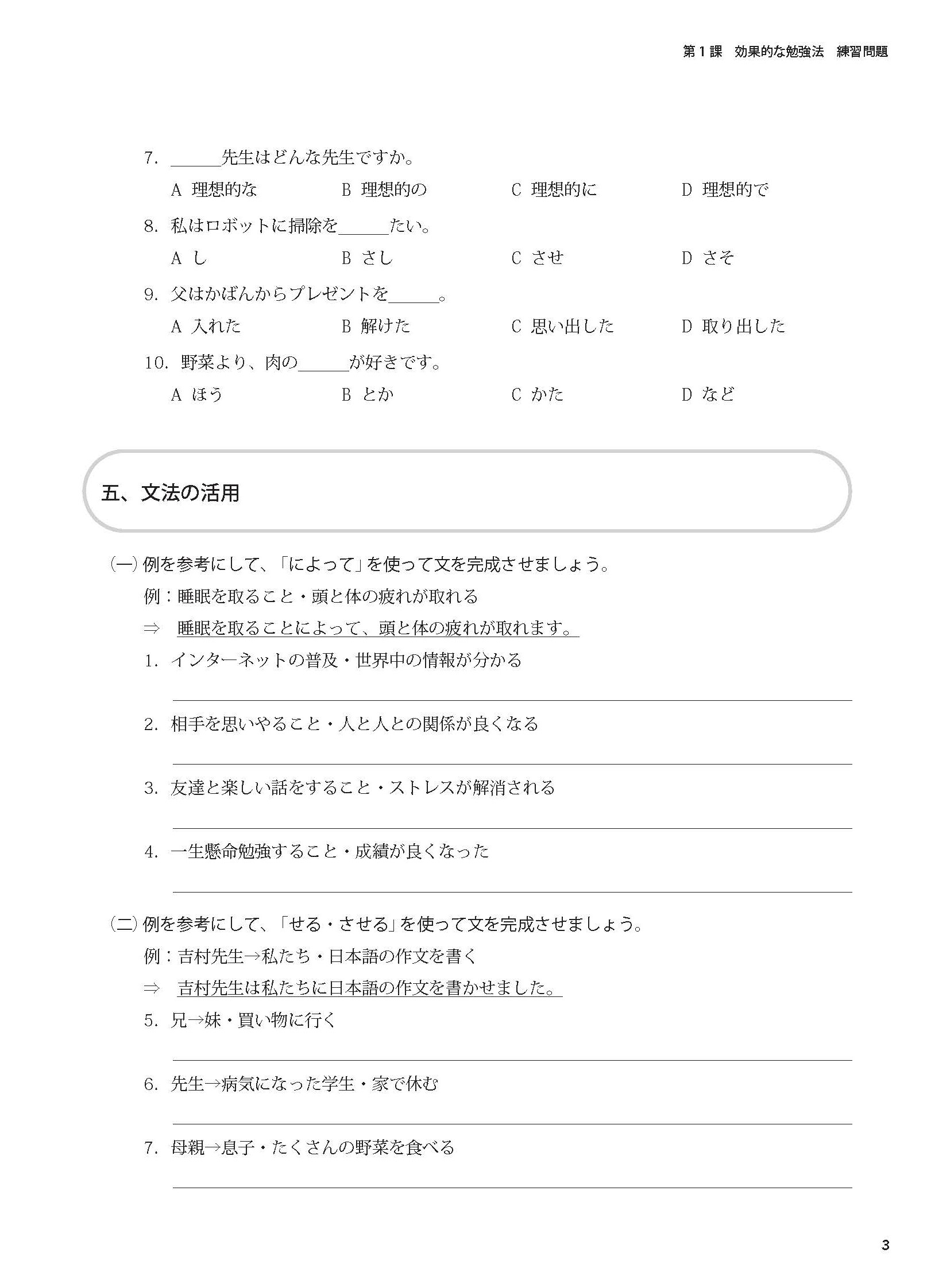 《新起点日语第三册同步练习册》力求做到内容充实,结构合理。首先对各课进行强化训练,然后利用同步测试题和单元测试题,检测学生对各课以及各单元知识的掌握情况。全书练习题设计兼具趣味性、灵活性、启发性、全面性,覆盖了听、说、读、写四个方面,注重培养学生的语言能力和学习能力。本书在内容编排和设计方面注重循序渐进、由浅入深、难易度安排合理,所选用的日语素材和语篇类型丰富多彩,注重培养学生的文化意识和思维品质。