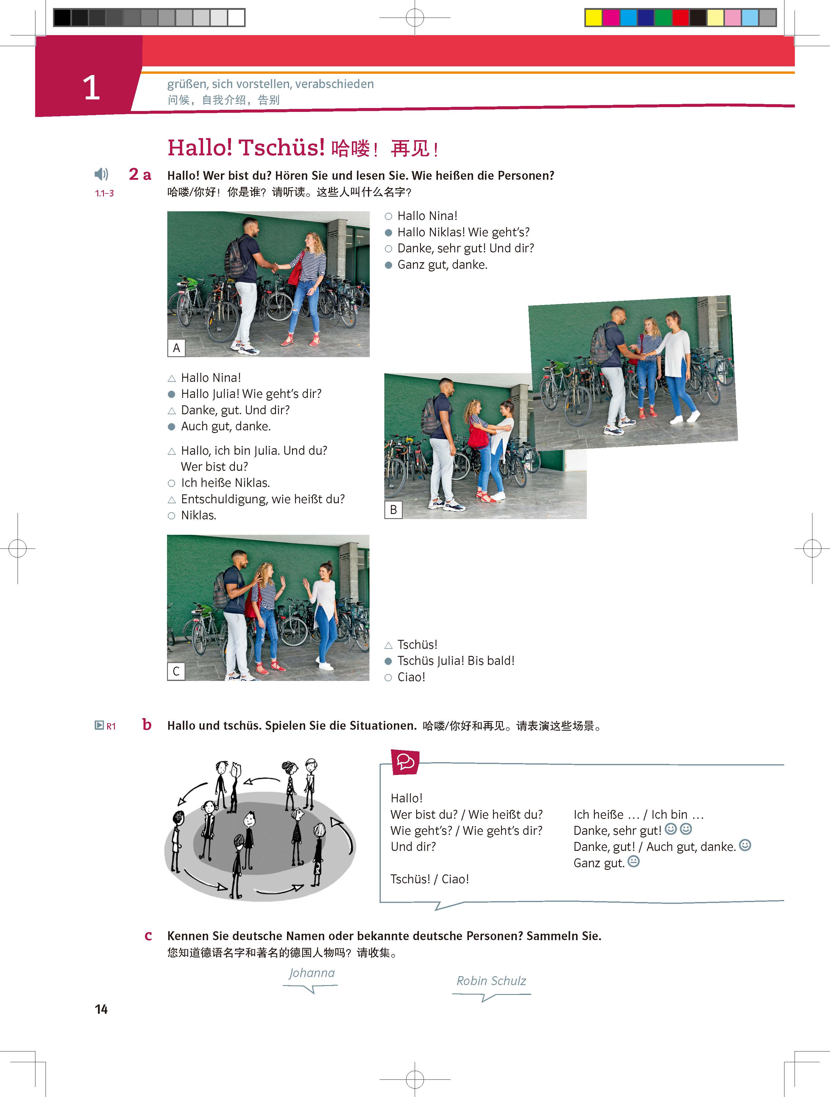 《你好!德语》系列教材的语法体系清晰,语言素材贴近德语文化圈的实际生活。在全面培养学习者德语能力的同时,还加强对德语交际能力的训练:书中不仅配有大量的音、视频资源,而且着重引导学习者运用所学内容进行自我表达和交流互动。此外,本套教材兼顾学习者对各类德语能力考试的备考需求,提供歌德证书、telcÖSD等考试的题型练习。