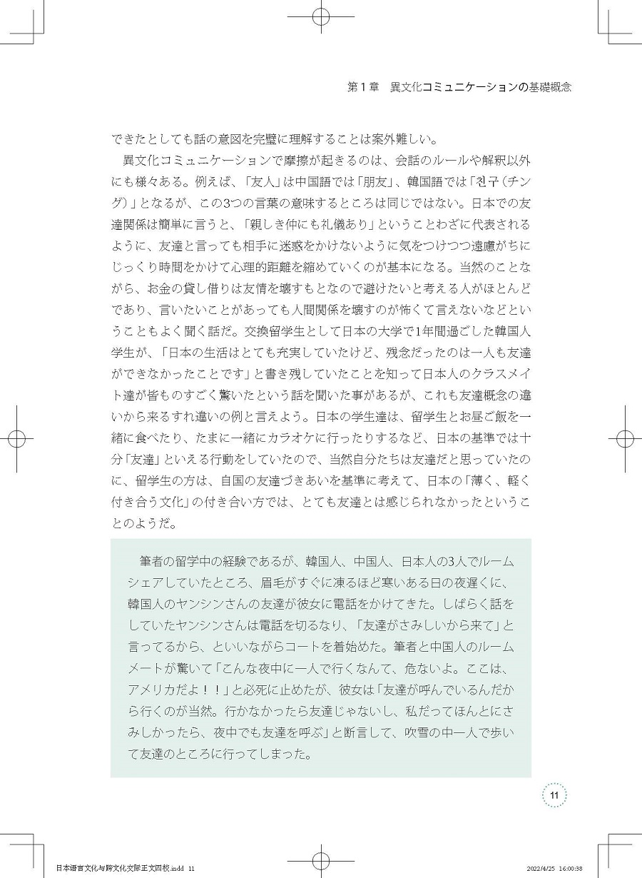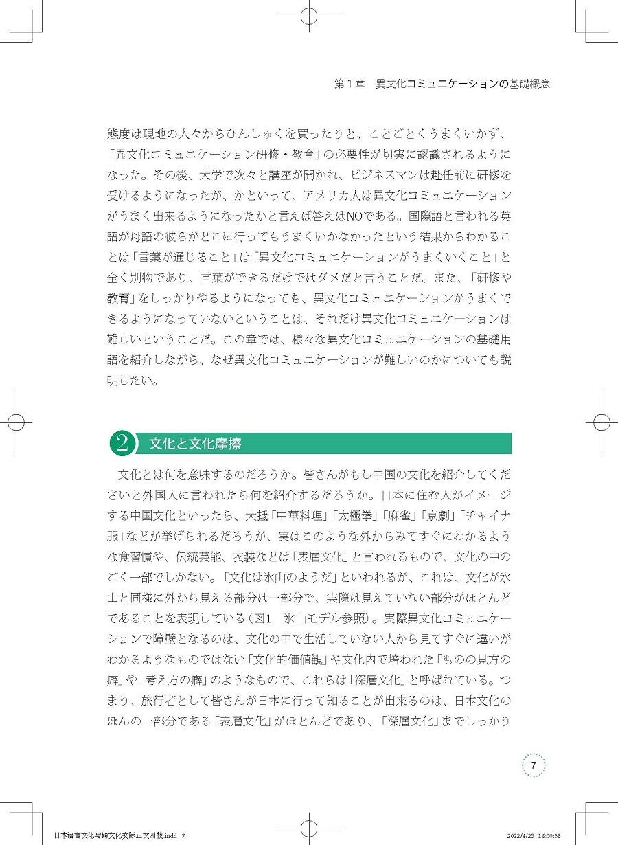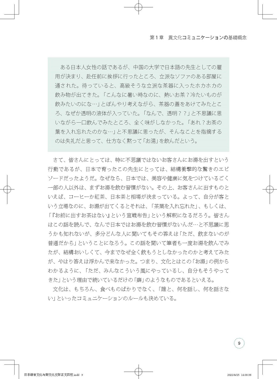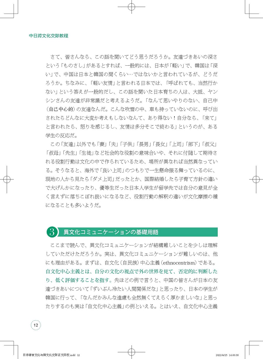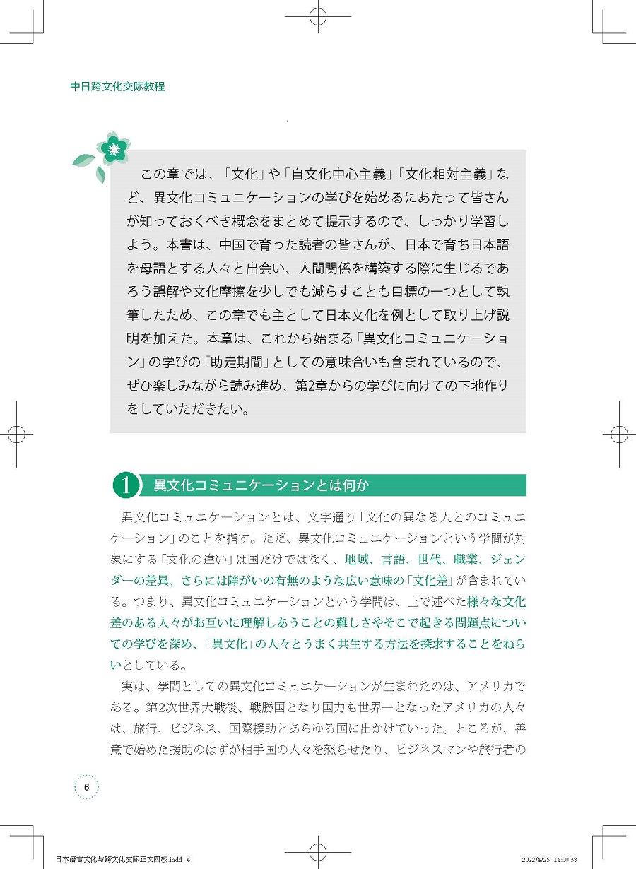 《中日跨文化交际教程》是一本面向日语专业本科高年级学习者的跨文化交际入门教材,全书分为14个章节,从介绍跨文化交际的基础概念入手,结尾于多文化社会下所需的跨文化交际方式,以循序渐进之势介绍讲解相关理论知识。教材的编写侧重理论与实践相结合,在介绍跨文化相关概念知识的同时会呈现中日间跨文化的具体事例以使学习者更加直观、深刻地理解跨文化交际的本质,并能实际运用到与异文化背景的相关人士交流中去。本教材由跨文化交际领域专业学者写就,旨在通过教授学生跨文化交际的理论知识和实际应用技巧,使其不仅能实际应用,而且可以做到由“学习日语”向“用日语学习”转变。