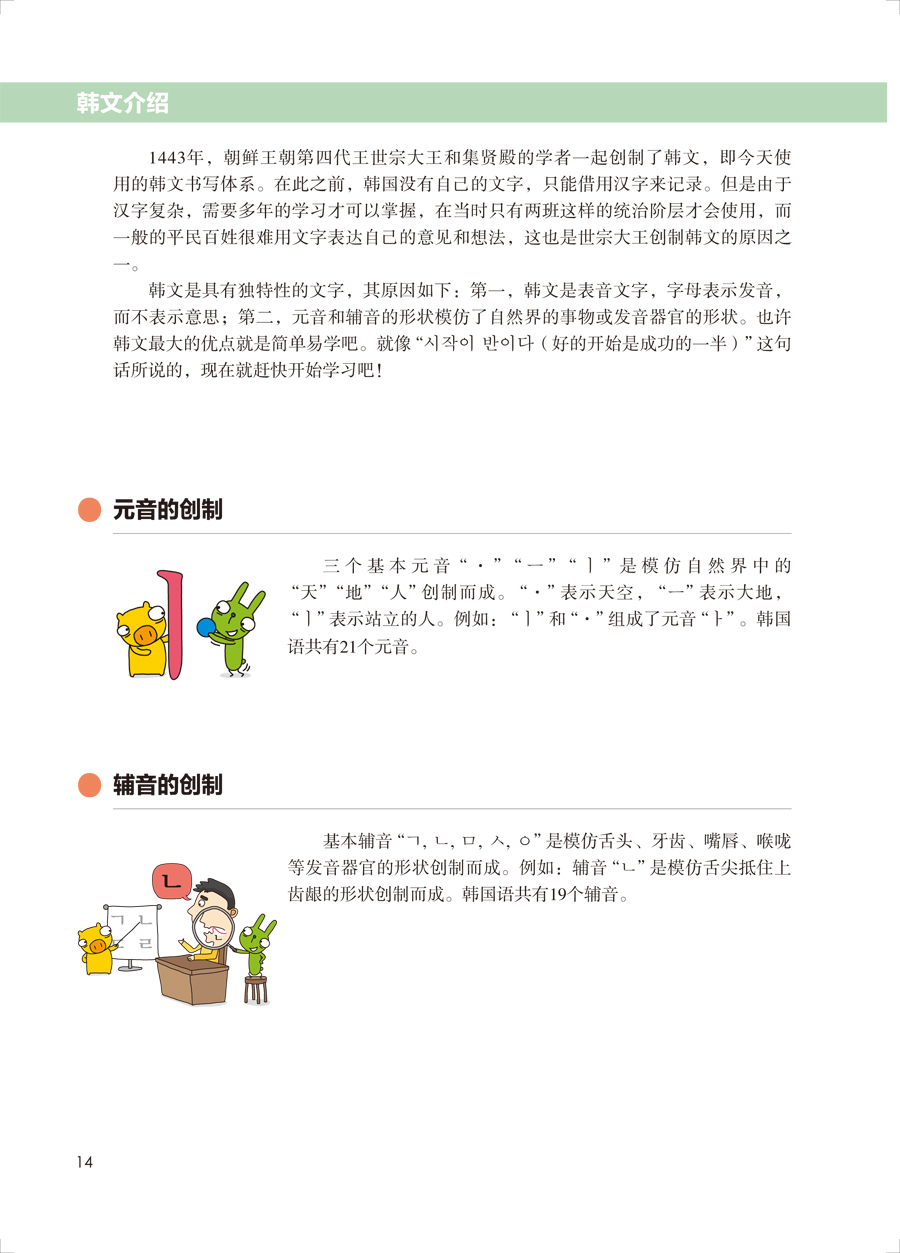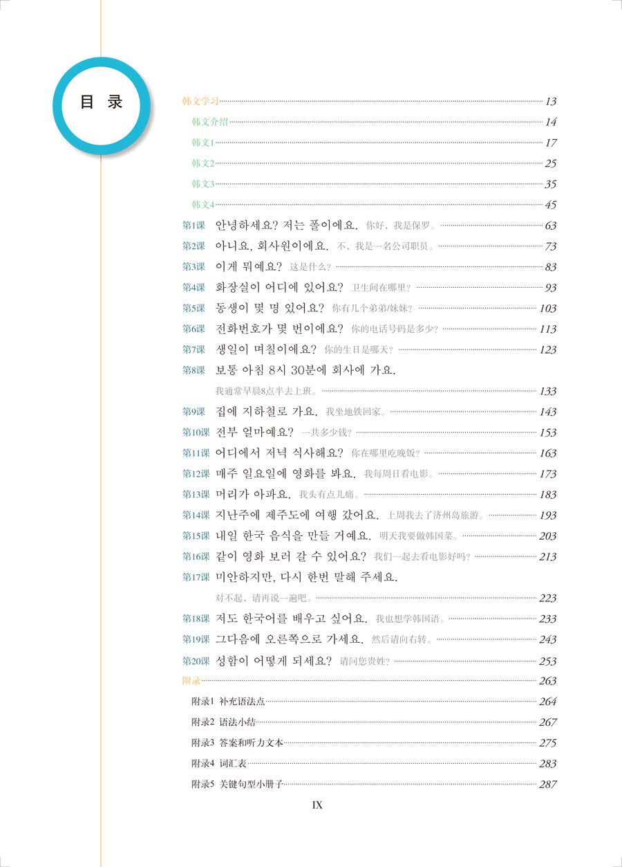 《韩国语口语入门第二版》由韩文学习、课文学习(1~20课)和附录三部分构成。韩文学习部分通过可拆分式图解和听力练习,帮助学习者系统地学习韩文的字母和发音;课文学习部分包括20课,每课包含2个对话,学习者可以接触到日常生活中最常见的20个主题和40个对话内容,循序渐进地掌握初级词汇和语法,并在不同场合下,使用适当的表达方式。每课的最后设置了文化浅谈模块,帮助学习者了解韩国的独特文化。附录部分提供了关键句型小册子,学习者可以剪裁下来,利用碎片化时间,通过小册子随时随地学习实用句型。