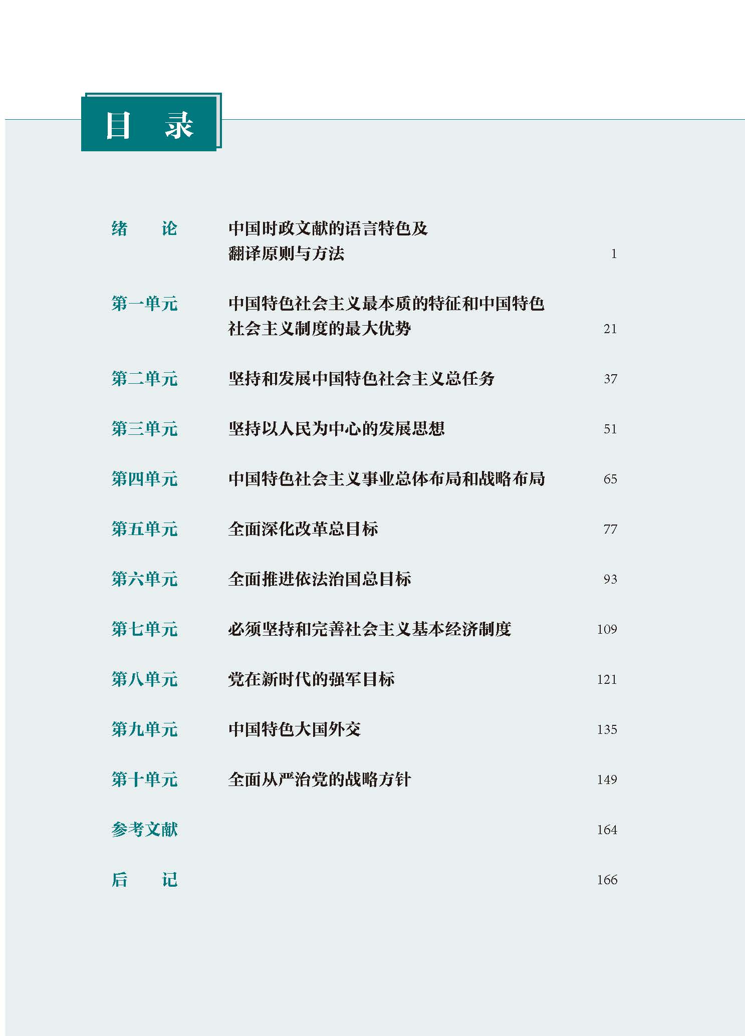 《汉俄翻译教程》分为绪论和10个主题单元。绪论介绍中国时政文献的语言特征、中国时政文献的翻译原则和中国时政文献的翻译方法。第一至第十单元为主题单元,每个主题单元探讨习近平新时代中国特色社会主义思想的一个重要方面,依次是:1)中国特色社会主义最本质的特征和中国特色社会主义制度的最大优势;2)坚持和发展中国特色社会主义总任务;3)坚持以人民为中心的发展思想;4)中国特色社会主义事业总体布局和战略布局;5)全面深化改革总目标;6)全面推进依法治国总目标;7)必须坚持和完善社会主义基本经济制度;8)党在新时代的强军目标;9)中国特色大国外交;10)全面从严治党的战略方针。