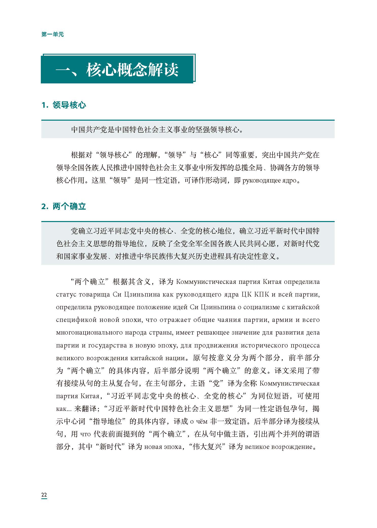 《汉俄翻译教程》将习近平新时代中国特色社会主义思想的学习与汉俄翻译能力的培养有机融合,实施价值塑造、知识传授和能力培养三位一体的课程思政理念。学生通过本教材的学习可以掌握时政文献汉俄翻译的能力,同时提高用俄语讲好中国故事的能力,推动中国更好走向世界,世界更好了解中国。