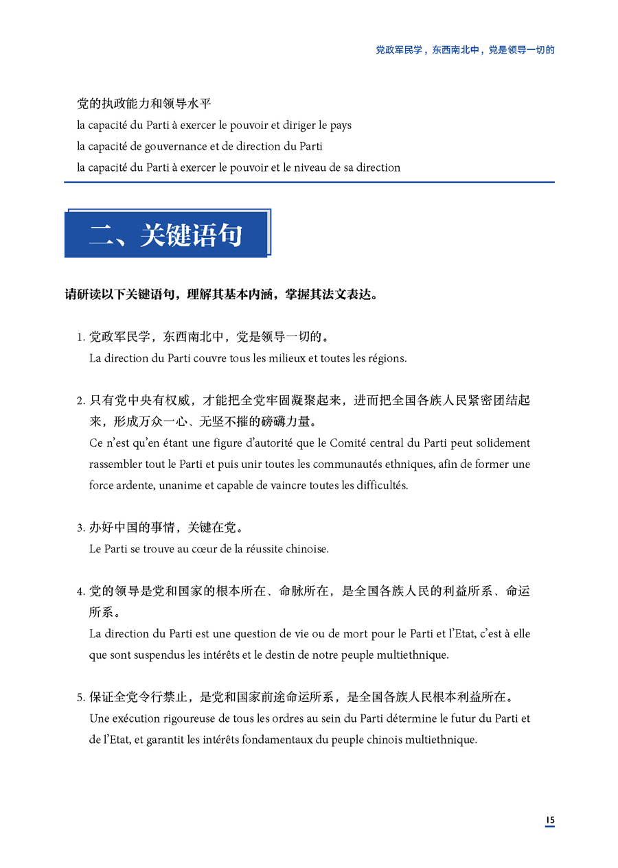 《高级汉法翻译教程》将习近平新时代中国特色社会主义思想的学习与汉法翻译能力的培养有机融合,实施价值塑造、知识传授和能力培养三位一体的课程思政理念。学生通过本教材的学习可以掌握中国时政文献翻译原则并提升翻译实操能力,在国际交往和传播中推动中国更好走向世界,世界更好了解中国。