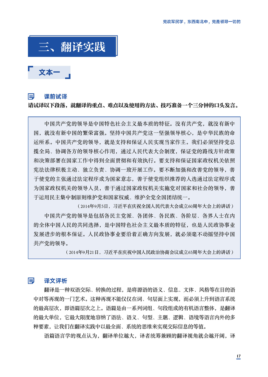 (两个文本,分为课前试译、译文评析、点评练习等环节)、课堂拓展练习(小组活动)和课后练习(翻译练习、分析报告)。
