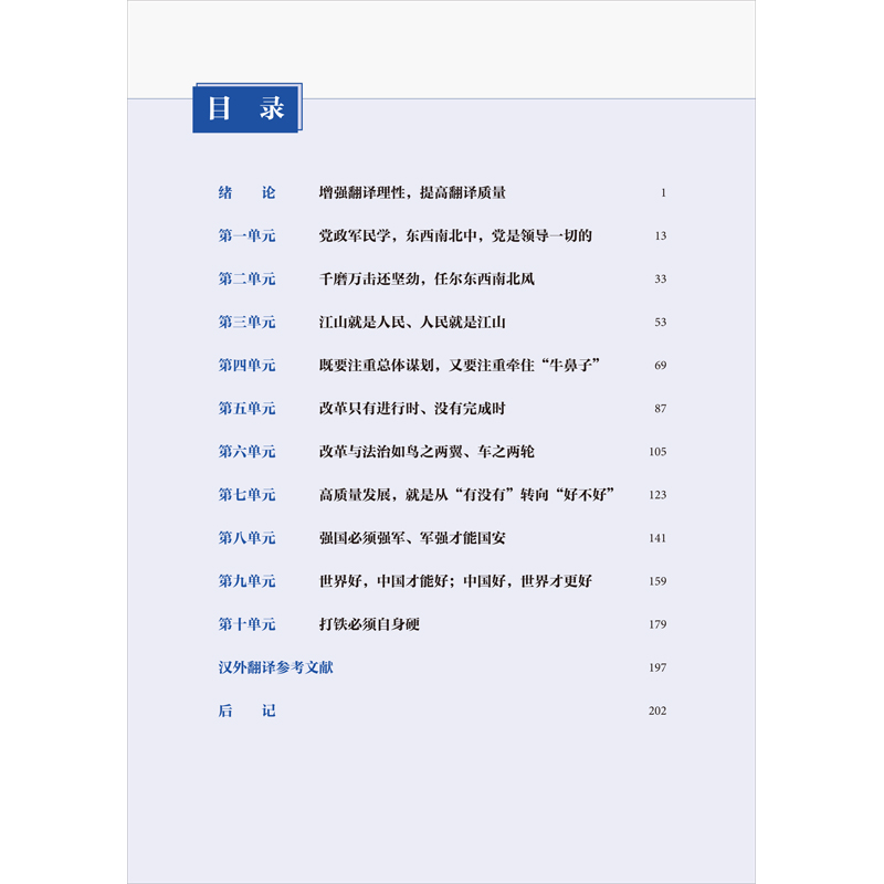 《高级汉法翻译教程》属于高等学校外国语言文学类专业“理解当代中国”系列教材法语系列教材,面向翻译硕士专业学位研究生、法语语言文学学术学位硕士研究生。教材更加重视语篇翻译策略,重视对翻译过程中关键问题和难点的处理,注重国际传播效果,同时兼顾不同类型时政文本的翻译演练。教材包含绪论、10个单元和后记。绪论深入阐述中国时政文献的特点、翻译原则,强调译者需要遵循的实践原则和方法论。各单元选篇主要来自《习近平谈治国理政》第一卷、第二卷、第三卷,《在庆祝中国共产党成立100周年大会上的讲话》和《中共中央关于党的百年奋斗重大成就和历史经验的决议》。各单元探讨习近平新时代中国特色社会主义思想的一个重要方面,包括:1)中国特色社会主义最本质的特征和中国特色社会主义制度的最大优势;2)坚持和发展中国特色社会主义总任务;3)坚持以人民为中心的发展思想;4)中国特色社会主义事业总体布局和战略布局;5)全面深化改革总目标;6)全面推进依法治国总目标;7)必须坚持和完善社会主义基本经济制度;8)党在新时代的强军目标;9)中国特色大国外交;10)全面从严治党的战略方针。各单元结构相同,分为核心概念(中法文对照)、关键语句(中法文对照)、翻译实践