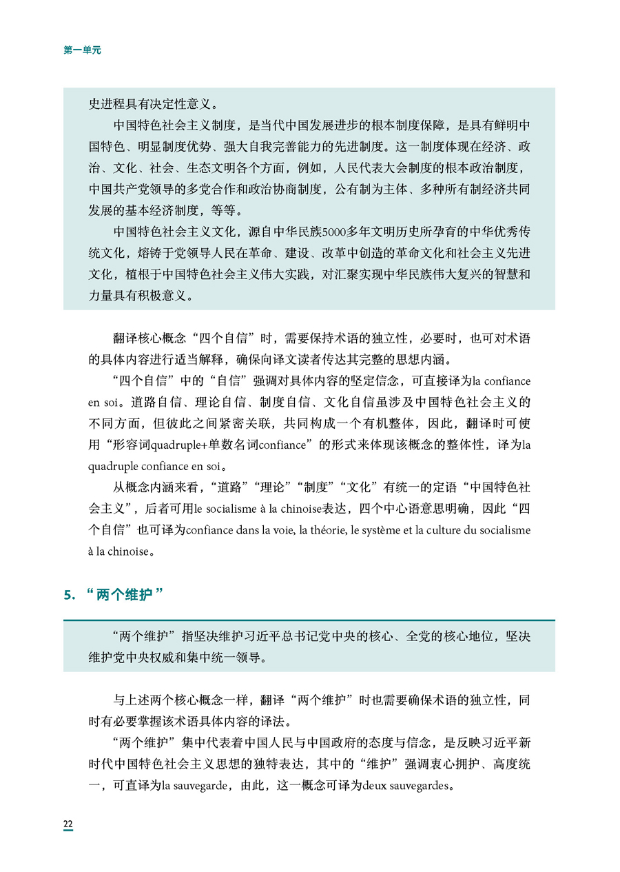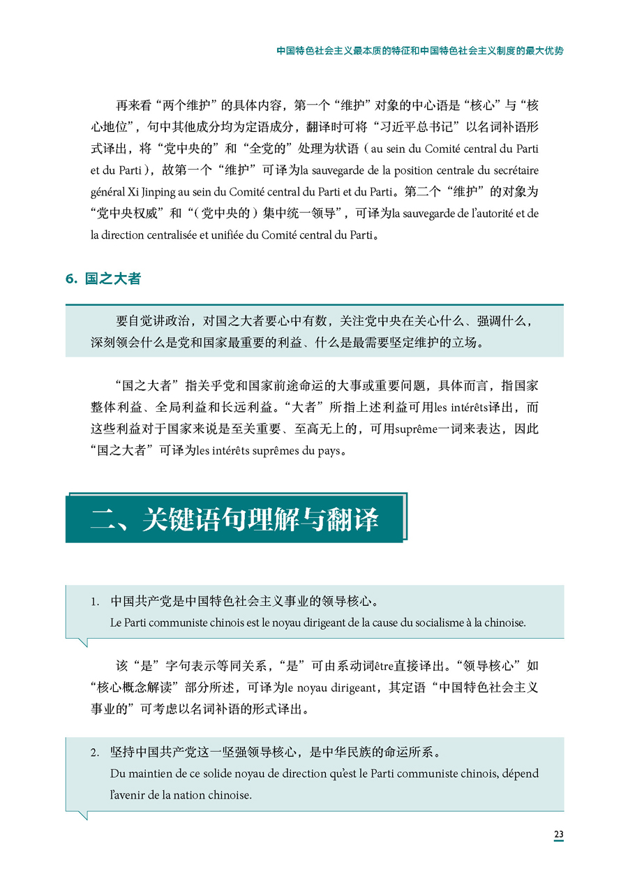 《汉法翻译教程》将习近平新时代中国特色社会主义思想的学习与汉法翻译能力的培养有机融合,实施价值塑造、知识传授和能力培养三位一体的课程思政理念。学生通过本教材的学习可以掌握时政文献汉法翻译的能力,同时提高用法语讲好中国故事的能力,推动中国更好走向世界,世界更好了解中国。