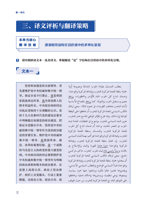 《高级汉阿翻译教程》为高等学校外国语言文学类专业“理解当代中国”阿拉伯语系列教材的一个分册,面向阿语翻译硕士专业学位研究生和阿语语言文学学术学位研究生。本书稿设计理念清晰,将习近平新时代中国特色社会主义思想的学习与翻译能力的训练相结合,从“核心概念”到“关键语句”,再到“文本试译”“译文评析”,输入的环节循序渐进、环环相扣,引导学生关注中国时政文献的特点和基本翻译原则,了解翻译的重点和难点,学会比较和判断译文高下,同时应用于自己的翻译实践中;“点评练习”引导学生关注翻译质量;“课后练习”关注输出效果,通过研讨和较高强度的翻译训练提高学生实战能力。