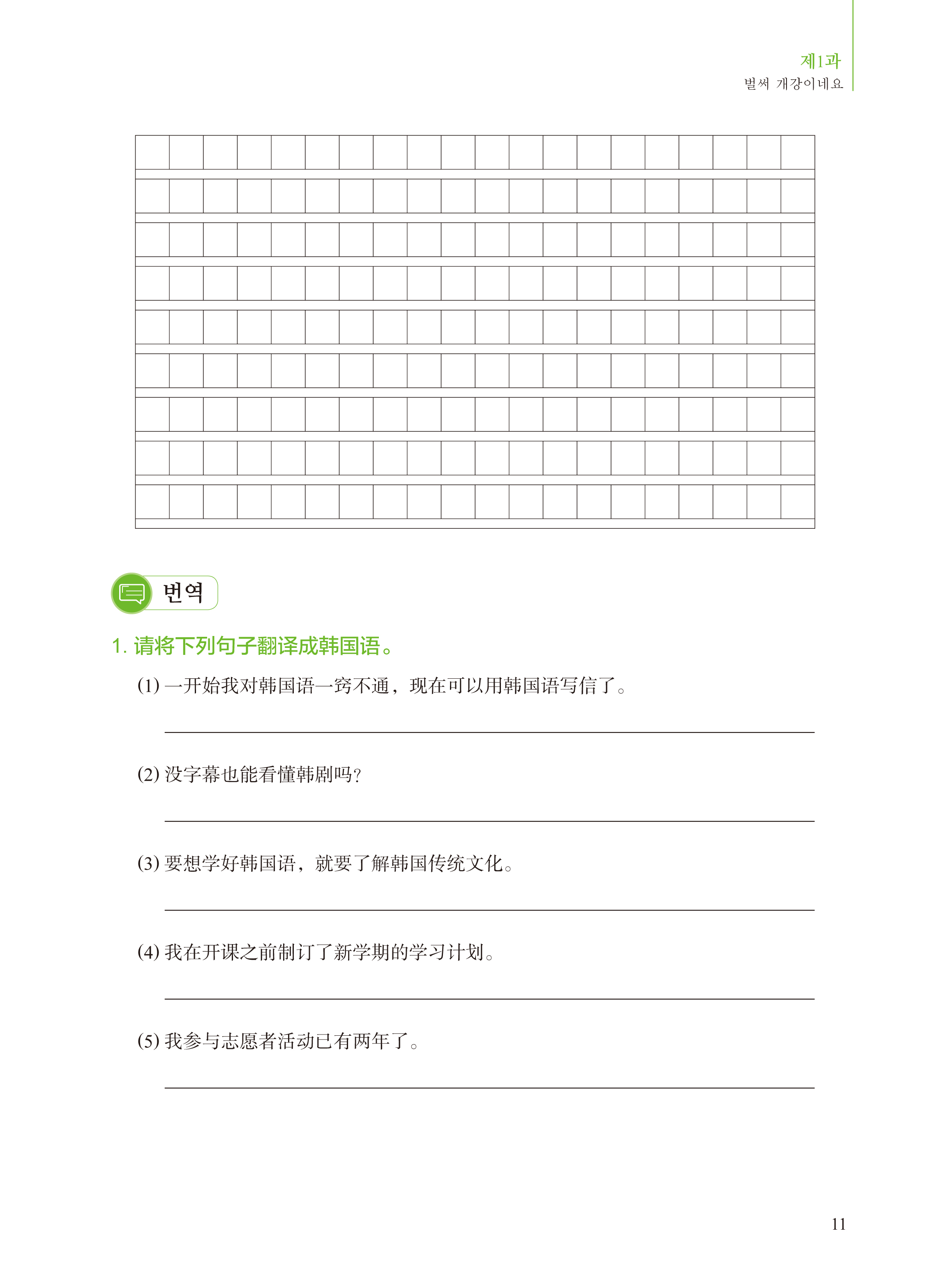 练习册包括15课的课文练习。课文练习着重考查学生对每课出现的词汇、语法点的掌握与运用能力,以及对每课学习目标中所要求的语言知识、社会文化知识与国别知识的掌握情况,分为词汇与语法、听力、阅读、写作、翻译五个模块。词汇与语法练习文本内容丰富、形式多样,让学生在丰富的语境中掌握并巩固词汇和语法的实际用法,提高语言组织能力和理解能力;听力练习的听力文本采用对话和短文的形式, 适当结合听说练习,让学生通过不同形式文本的听力练习提高朝鲜(韩国)语听力理解能力和语言表达能力;阅读练习的文本涵盖了每课的主题和学习目标中要求的知识内容,帮助学生拓展文化视野、提高跨文化意识,同时让学生通过选择、判断、读写有机结合的练习提高朝鲜(韩国)语阅读理解能力;写作练习强调循序渐进、由简到难, 合理安排读写练习,让学生通过所提供的信息写出单词、句子,最终根据自己的情况写出一篇文章;翻译练习为了增强学生的语言转换能力,设有中韩、韩中五个句子的翻译练习,句子中包含每课的重点词汇和语法点。