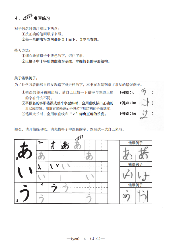 3.手写体字体:由于印刷体是设计字体,与手写出的文字有微妙的差别,因此,本书采用了更为简洁和自然的手写体字体作为练习书写每一个文字时的字样。此外,本书还把初学者容易写错的字形归纳成“错误例子”予以提示。通过这些例子,可以使您避免犯同样的错误。