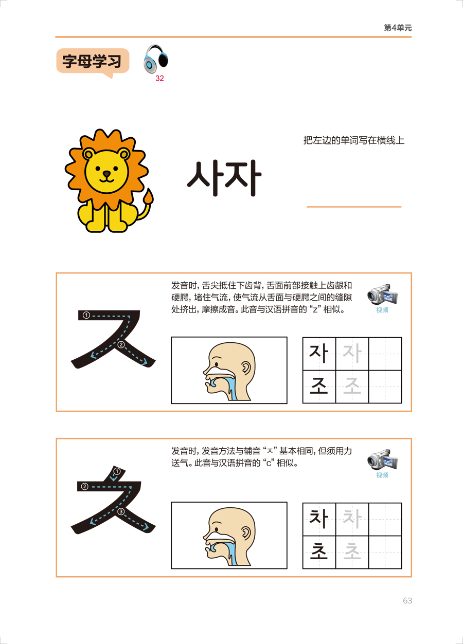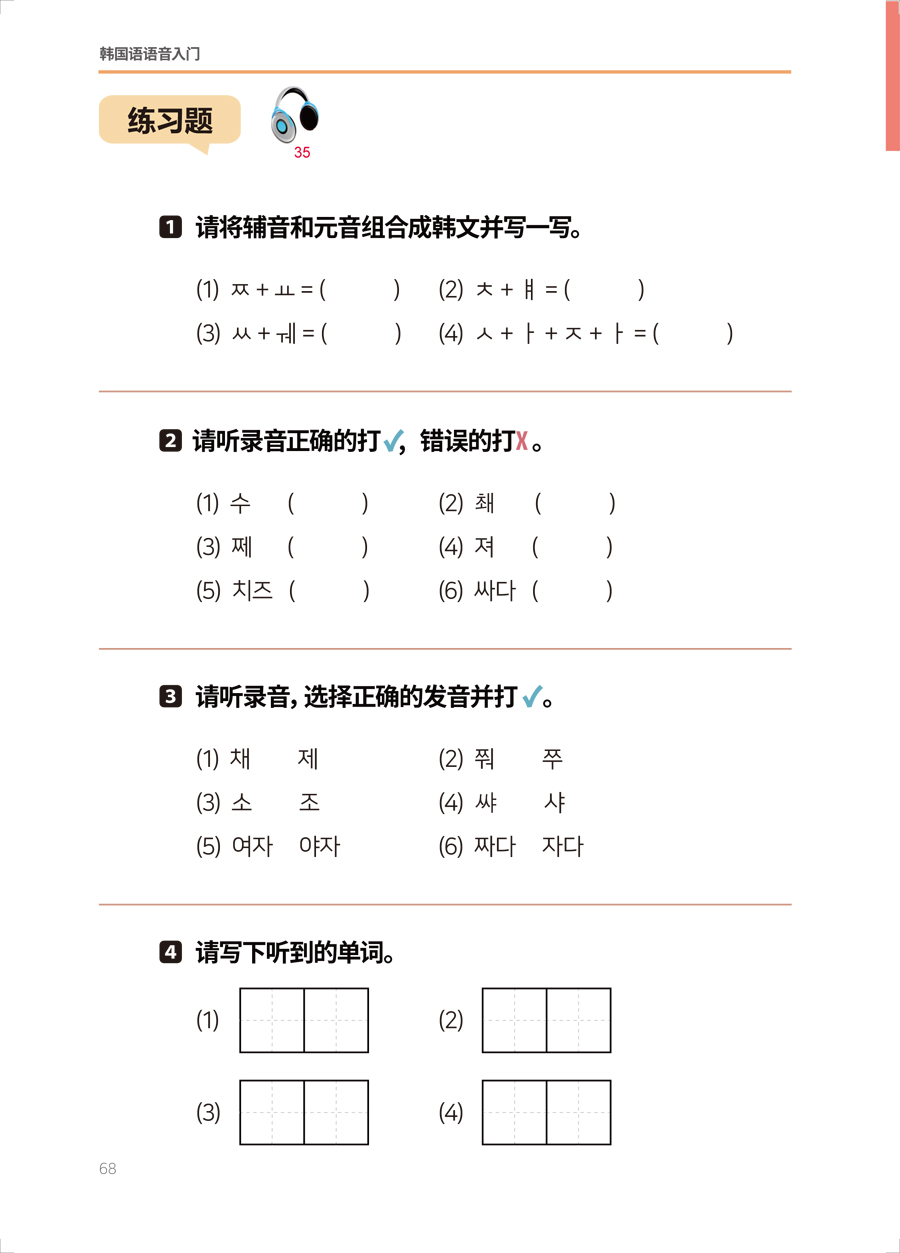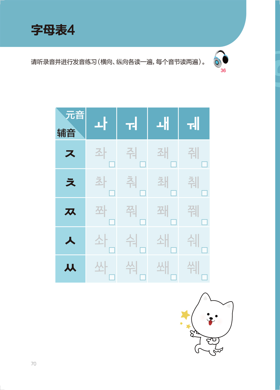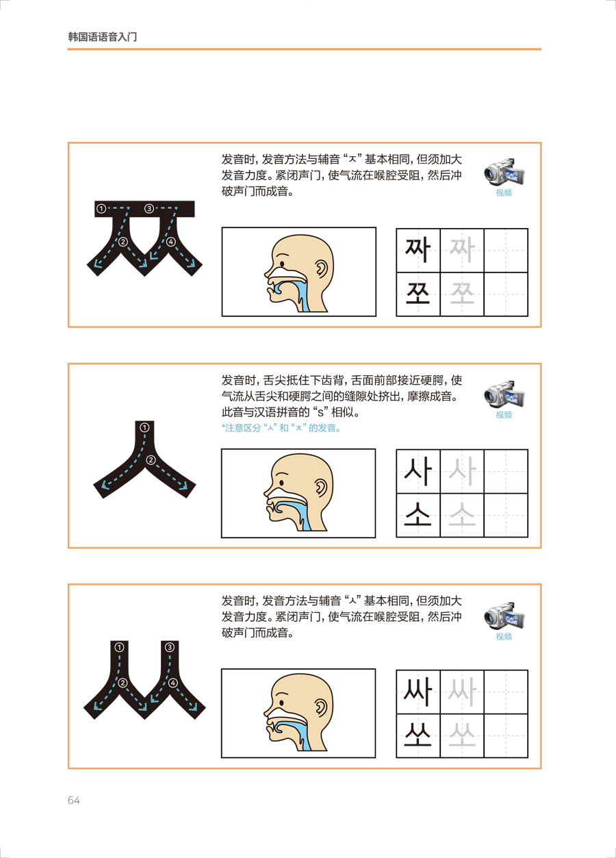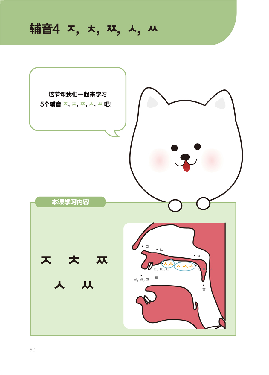 《韩国语语音入门》将元音、辅音、收音按照发音方法、难易度等进行分类,分单元循序渐进地进行讲解。语音学习的每个单元均包括字母发音、字母活动和字母表。语音学习部分详细地讲解每个字母的发音方法、书写方法,设置了丰富的发音练习,尤其强调如何分辨易混淆的字母的发音,精准解决中国学生普遍存在的发音的难点和痛点。每个单元在讲解完部分元音和辅音后,会给出一些单词练习,帮助学习者通过单词熟悉已学过的字母发音。学习者还可以通过丰富的练习题、有趣的字母活动和发音表巩固本单元的字母发音,并熟记字形。
