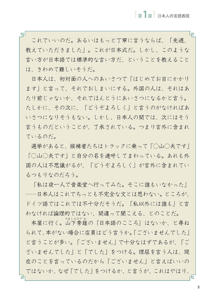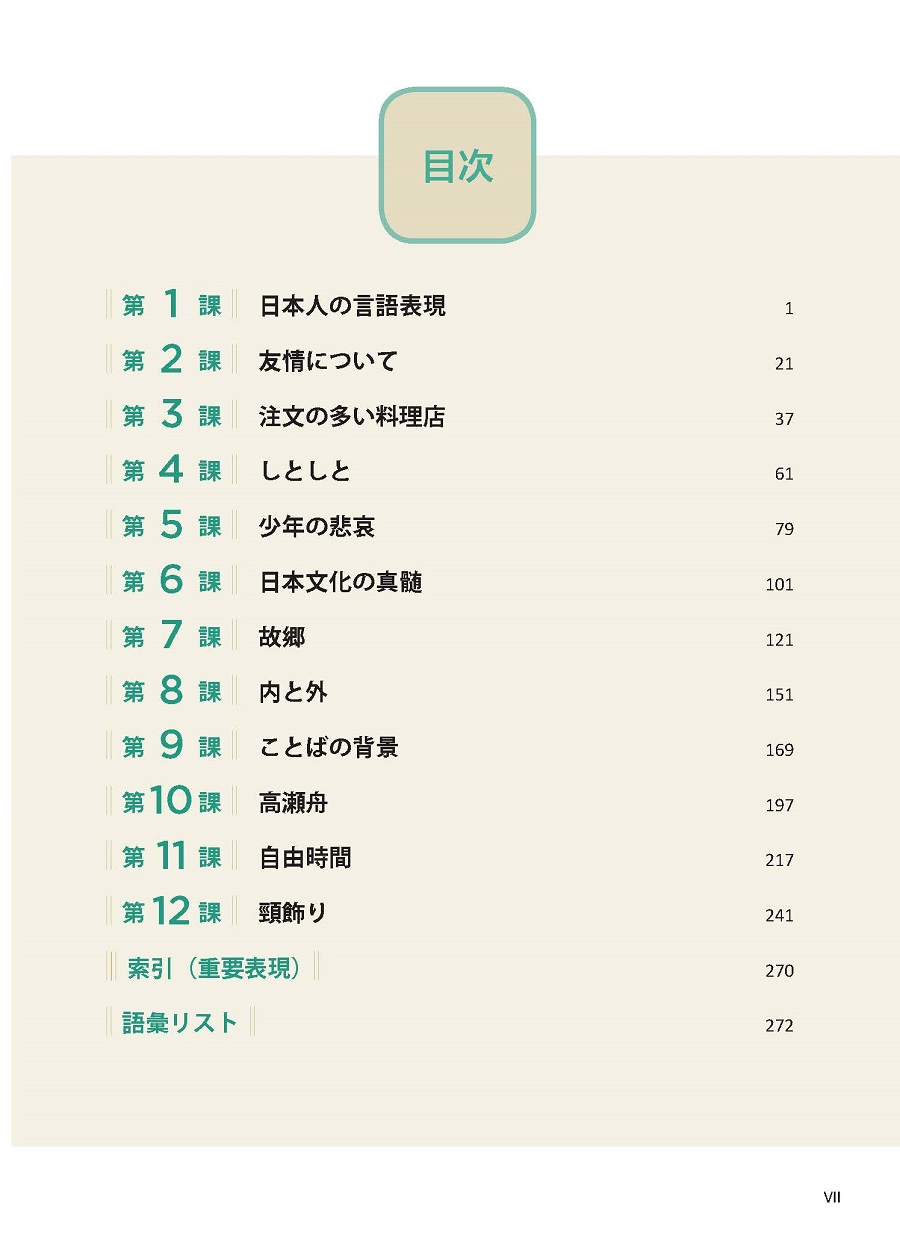“高级日语”系列教材是以高等学校日语专业三年级学生为对象编写的教材。本教材依据了《普通高等学校本科外国语言文学类专业教学指南2020》、参照了日本国际交流基金会的《日语教育标准2010》编写而成。《高级日语第二册》共12课,每课由“学習目標”“調べましょう!”“本文”“新しい言葉”“重要表現”“練習問題及び学習活動”“言語・文化・社会コラム”“自己チェック表”等板块构成。《高级日语第二册》将课堂的教学重点从大学一、二年级的词汇、语法、句型的学习和掌握逐渐过渡到分析文章内容、理解语言的深层含义和掌握语言文化背景等方面,从而使学生能够较为自如地进行中日间跨文化沟通交流。同时,通过对语言及社会文化现象的分析来培养学生基于跨文化沟通基础上的思辨能力。引导学生正确认识中国和日本的国情,培养学生对中华文化的自信,帮助学生树立正确的人生观和价值观。