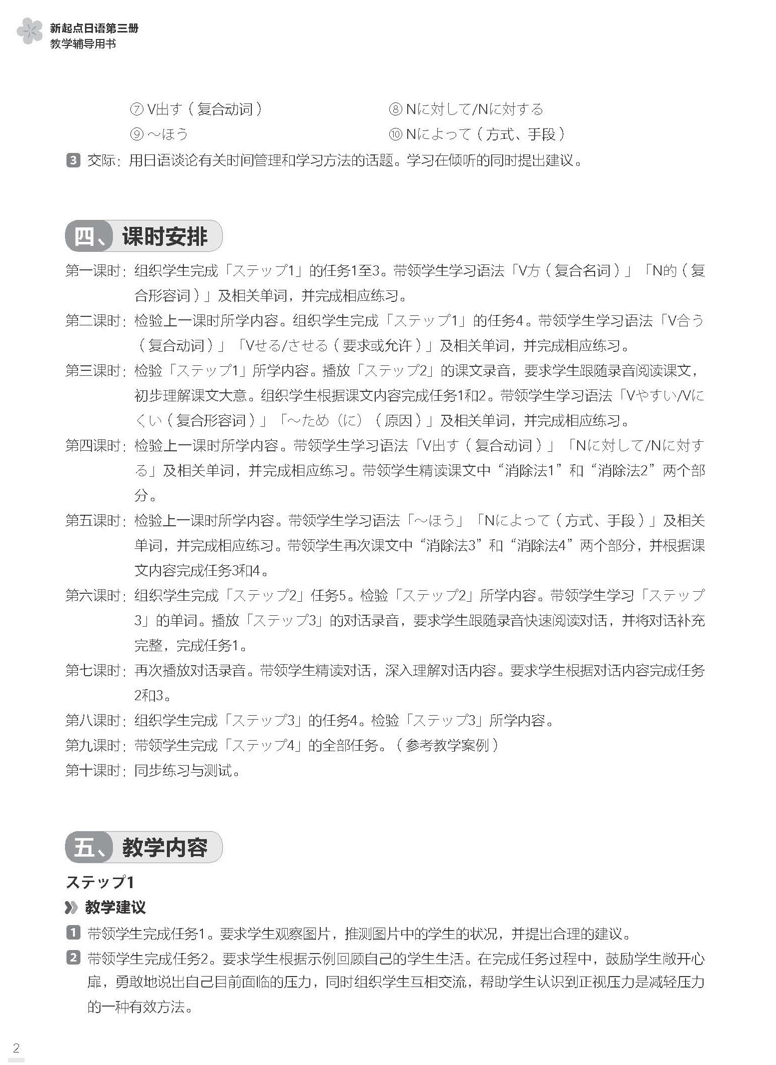 《新起点日语第三册教学辅导用书》是《新起点日语第三册》配套的教师教学辅助用书。本书旨在帮助教师更好地理解和使用教材,提升教学效果。本书内容包括教学设计思路、能力目标、知识要点、课时安排、教学内容、教学案例、课文翻译、参考答案等。