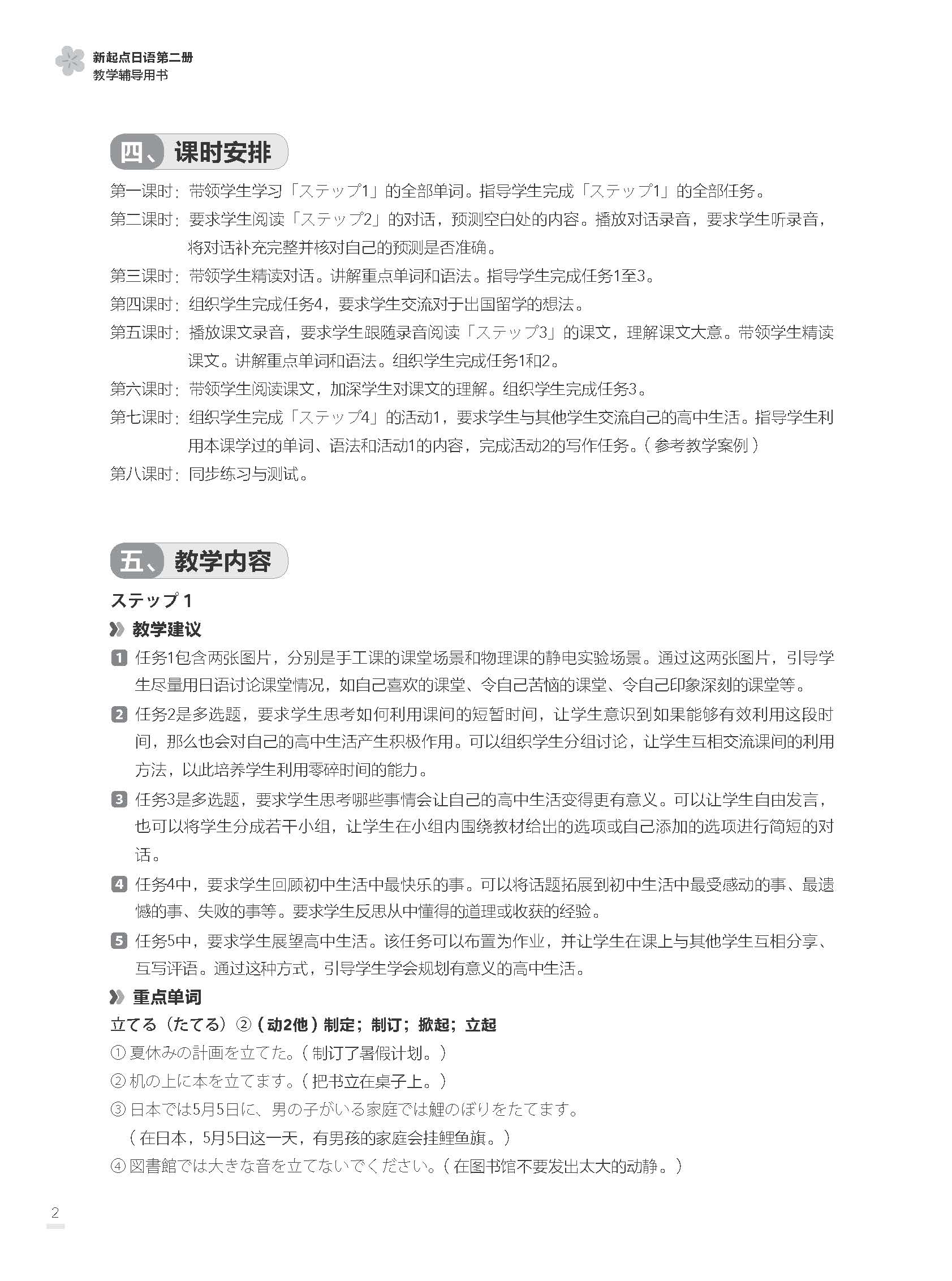 《新起点日语第二册教学辅导用书》是《新起点日语第二册》配套的教师教学辅助用书。本书旨在帮助教师更好地理解和使用教材,提升教学效果。本书内容包括教学设计思路、教学目标、知识要点、课时安排、教学内容、教学案例、课文翻译、参考答案等。
