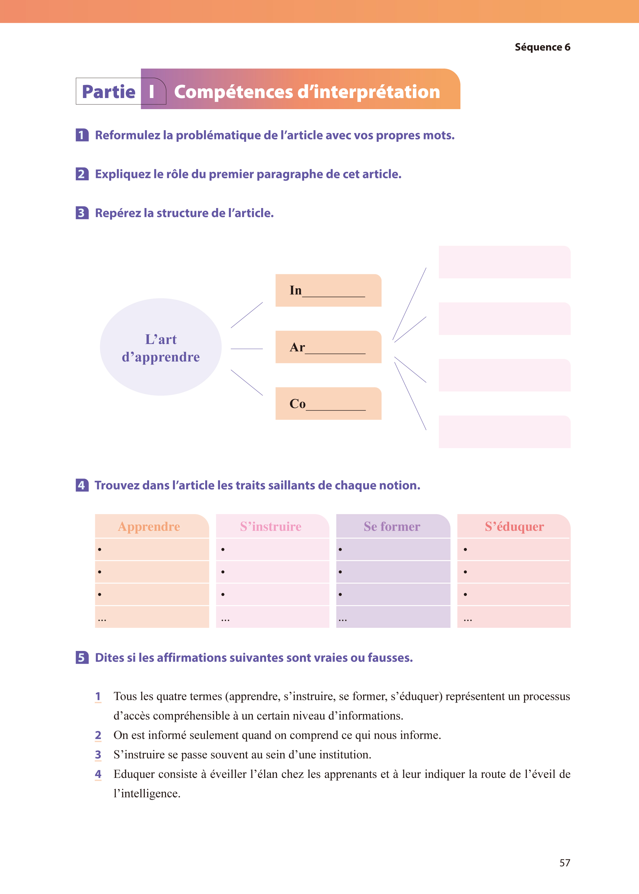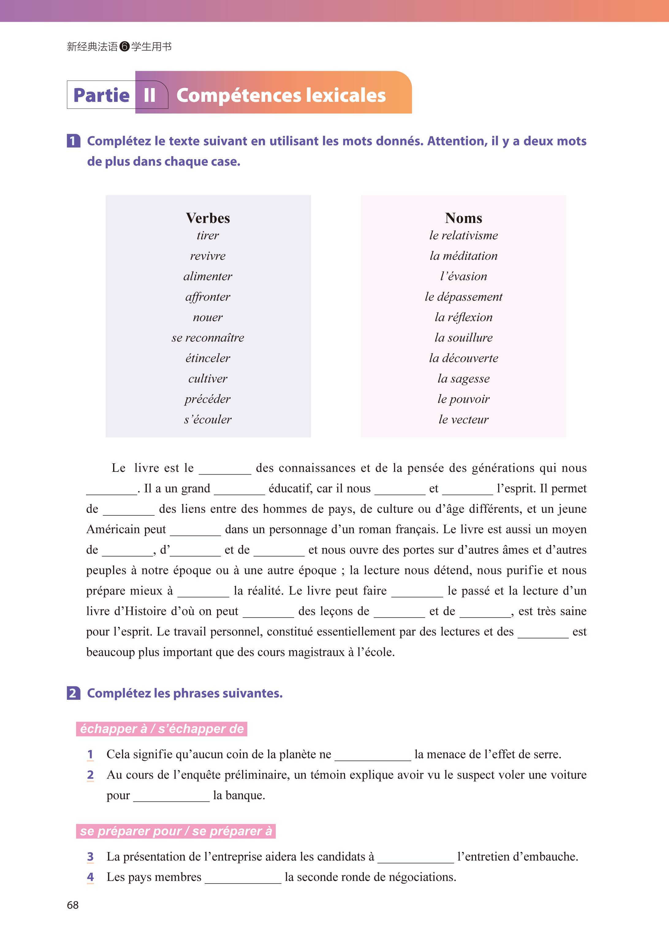 《新经典法语6学生用书》为法语专业本科高年级精读课教材,是“新经典法语”系列教材之一,适用于本科三年级下的学生。本册教材包含4个单元,每单元4课,共计16课。每个单元的前3课为学习课,分为5个模块:语篇学习、解读阐释能力、词汇运用能力、语法运用能力和语言产出能力。每个单元的第4课为文化拓展和单元总结课,包含两部分:前半部分选取与单元主题相关的视频作为学习素材,设计相应的听、说、读、写训练;后半部分从词汇、语法等方面对本单元的重点语言现象进行总结梳理,通过短小语篇翻译的形式复习本单元的重要表达方式。