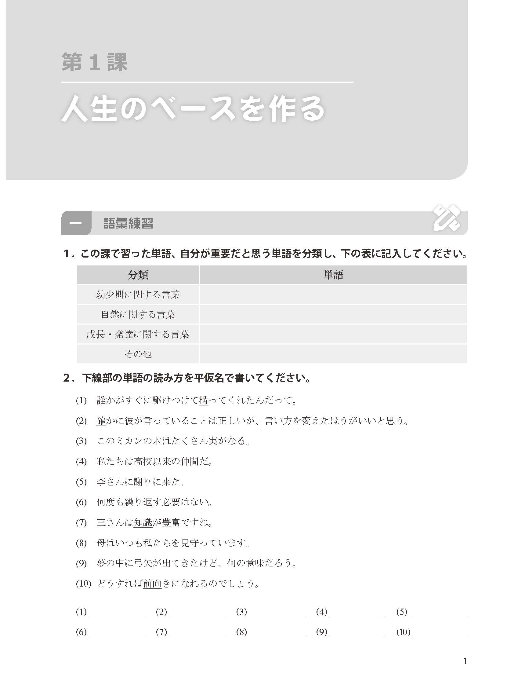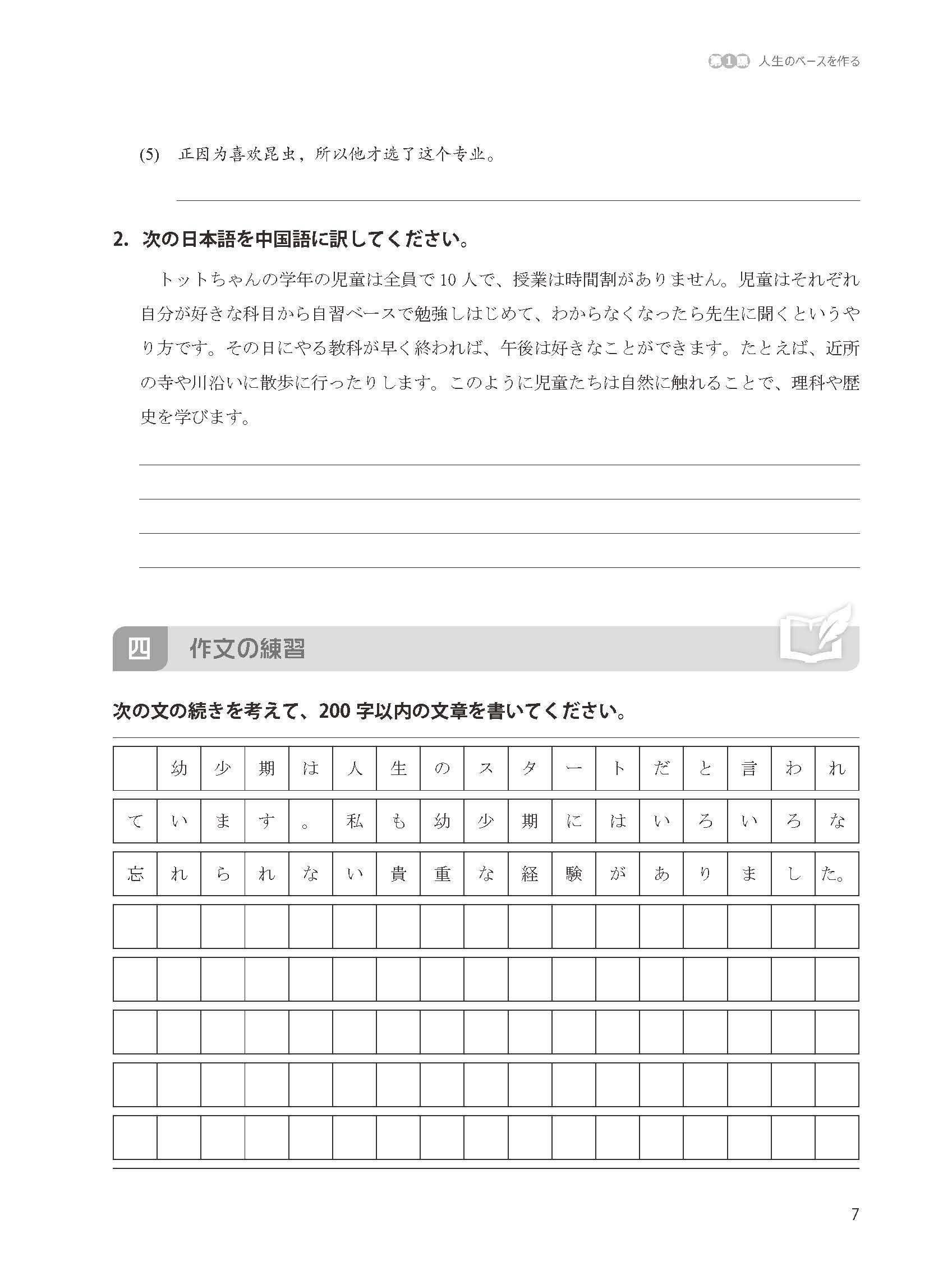 《新一代大学日语第二册同步练习册》为《新一代大学日语第二册》的配套练习册,依据《大学日语教学指南(2021版)》《大学日语课程教学要求》《大学日语四、六级考试大纲(2011年版)》编写而成。由于大学日语课时有限,为了帮助学习者夯实语言基础、增强自主学习意识,《新一代大学日语第二册》编写团队结合主教材学习内容编写了本练习册。《新一代大学日语第二册同步练习册》包含12课单课练习和4个单元测试。本练习册包含教材(共12课)的单课练习和4个单元测验。单课练习由词汇练习、语法练习、翻译练习、作文练习组成,单元测验由听力、词汇、语法、阅读、造句五大模块组成。单元测验的题型对接大学日语四级考试。