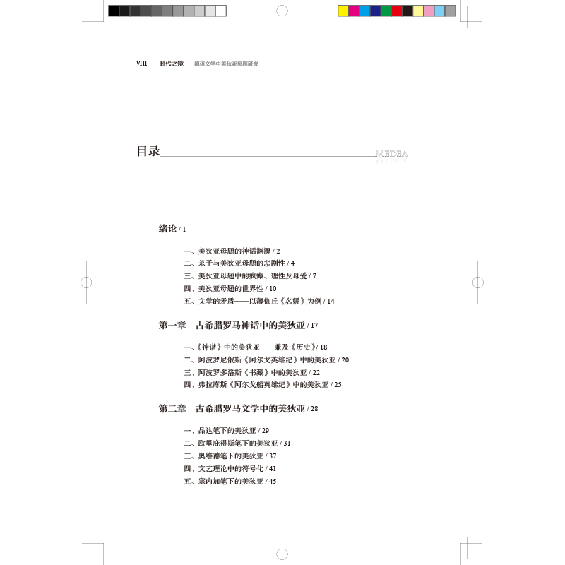 《时代之镜——德语文学中美狄亚母题研究》基于国内外现有研究,首先回溯至古希腊罗马的神话和文学,追溯德语文学中美狄亚母题的源头。在此基础之上,本书广泛搜集材料,挖掘新材料(如《报复伊阿宋不忠的美狄亚》,戈特舍德、赫尔德等人的作品),整理和揭示美狄亚母题在德语文学不同文化语境、不同文体中的演变,完善德语文学中美狄亚母题史,意在梳理其轨迹衍生和嬗变的脉络,尝试结合社会文化语境、历史因素、文学因素探究母题流变的原因,发掘新视角,并重新审视和解读文学个案。本书着眼于美狄亚母题在德语文学中构成的传统,故文学个案及其借鉴的文本之间的关联及差异是论著关心的一大问题。在关心母题史的同时,书稿具体行文将更多地落墨于“新”的一面,即德语作家如何在新的社会语境中,尝试更新甚至颠覆美狄亚形象。对于既有文献研究较少的文本,如戈特舍德作品中涉及的美狄亚、布雷绍逝世后出版的《报复伊阿宋不忠的美狄亚》、尼采文字中的美狄亚、布莱希特诗歌中的美狄亚等,本专著将特别加以关注。此外,本书搜罗造型艺术作品(特别是绘画、书影)中的美狄亚,直观地展现研究对象;附录还关注美狄亚形象在华译介,并收录笔者翻译的涉及美狄亚的诗歌和文本。