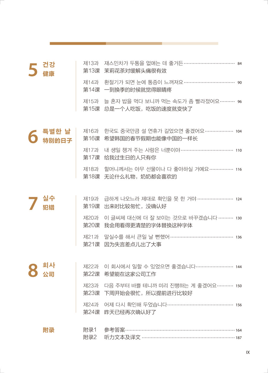 《新标准韩国语新版中级上练习册》是《新标准韩国语新版中级上》的辅助教材,由八个单元构成。每个单元包括三课,每课均由词汇和句型练习、语法练习和综合练习构成。词汇和句型练习部分包括单词分类、填空、连线等题型,学习者可以通过做题在各种语境中明确词汇和句型的含义和用法,做到举一反三。语法练习部分按照主教材的语法条目进行练习,考查学习者对重点语法的掌握情况,达到复习和深化学习的目的。综合练习部分包括听力、阅读和写作三种题型,全面考查学习者对主教材内容的掌握情况。学习者通过做丰富的练习题可以有效巩固在主教材中学到的内容,并进行整理和总结,在多样化的语境中强化重点词汇和语法的训练,提高语言的实际应用能力。