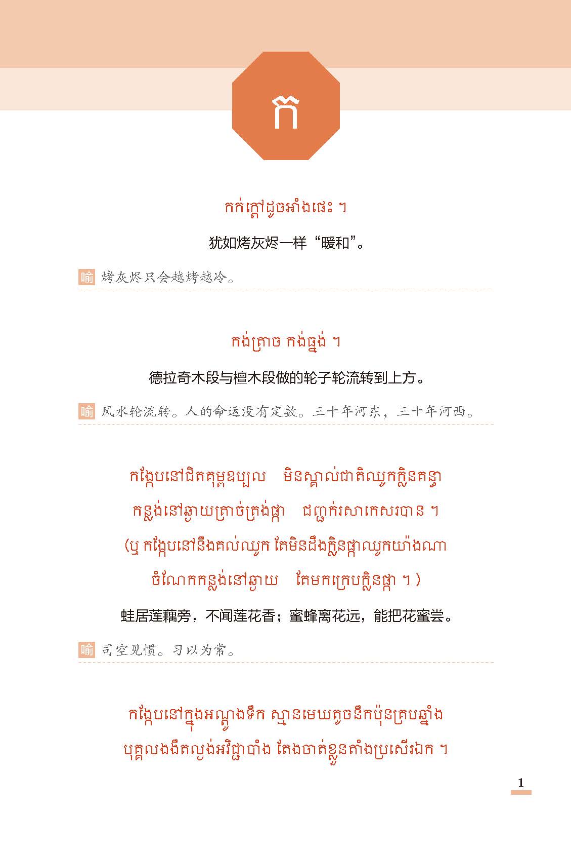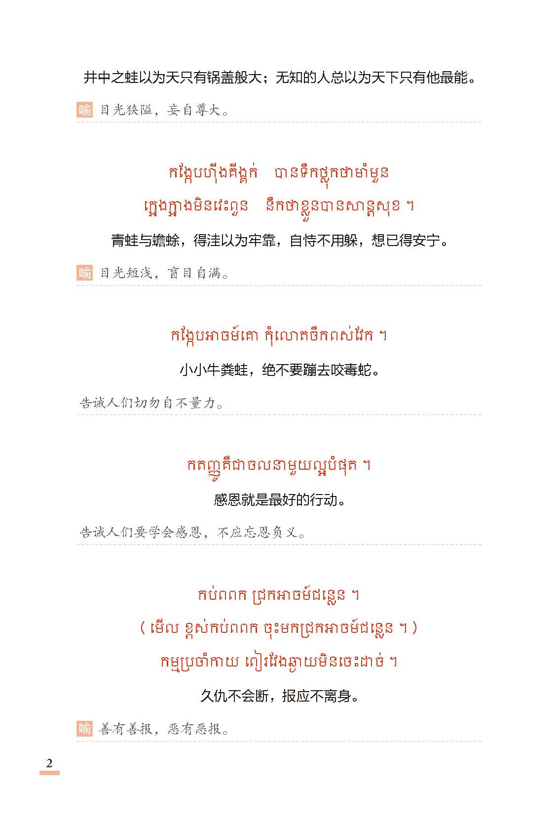 《柬埔寨谚语选编》甄选了1700条左右加以整理和拓展,编译成该书,以供研究柬语语言文化的学者、从事柬语教学或翻译工作者以及学习柬语的高校学生作为参考资料。柬埔寨谚语语言精练、言简意赅、形象生动、说理透彻、实用性强、便于记忆。合理运用柬埔寨谚语,会给我们的语言和文字锦上添花。在日常的交流和写作中恰当地使用柬埔寨谚语,可以使语言变得更加优美、更富于感染力和说服力。