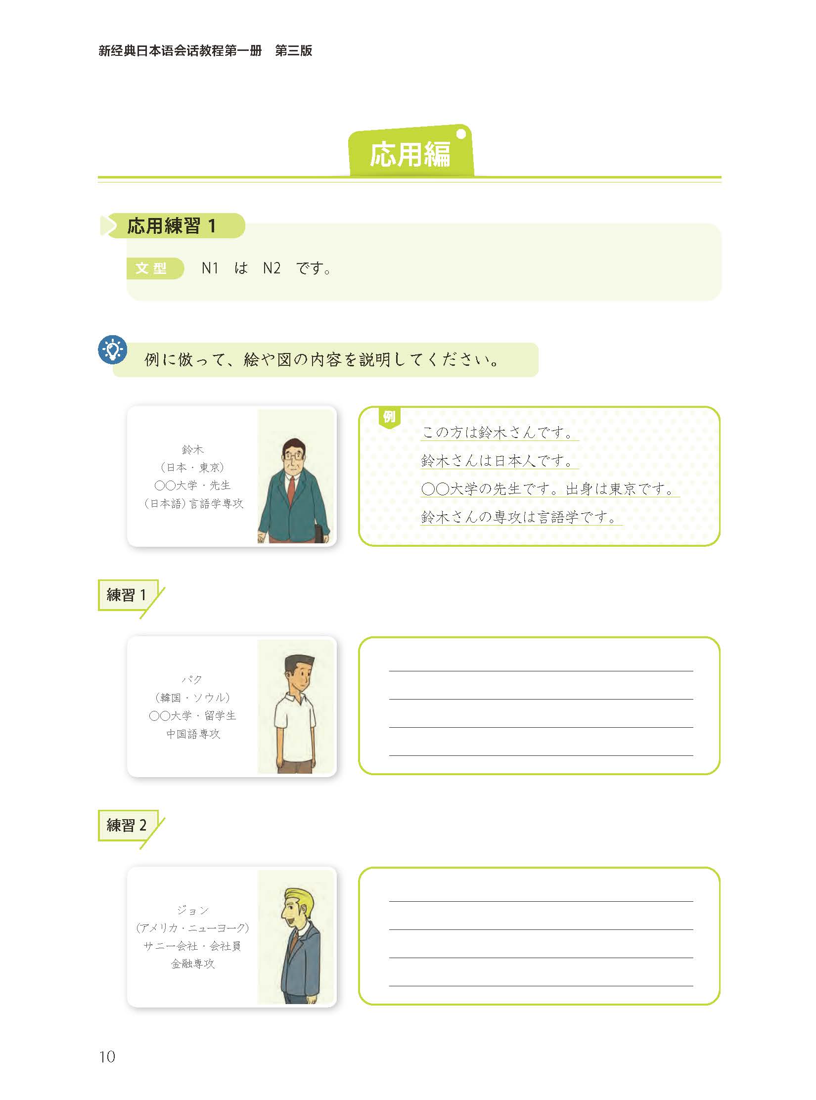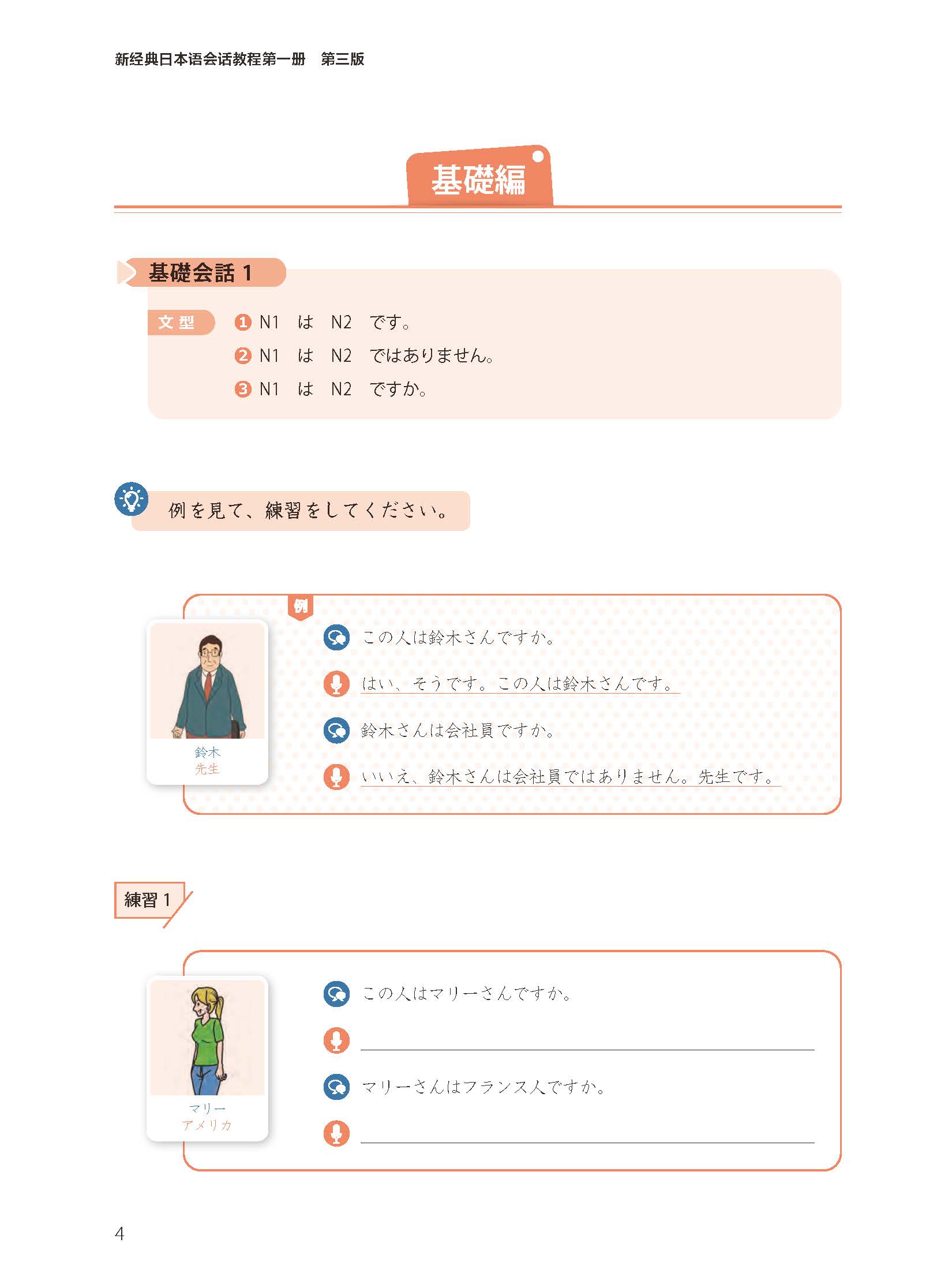 《新经典日本语会话教程第一册(第三版)》共14课,以语法为纲,培养学习者的基础会话能力。每课由「ウォーミングアップ」「基礎会話」「応用練習」「挑戦してみましょう」这4部分组成。每个「基礎会話」有4—6个练习,每个「応用練習」有3个练习。「挑戦してみましょう」分为两个部分。