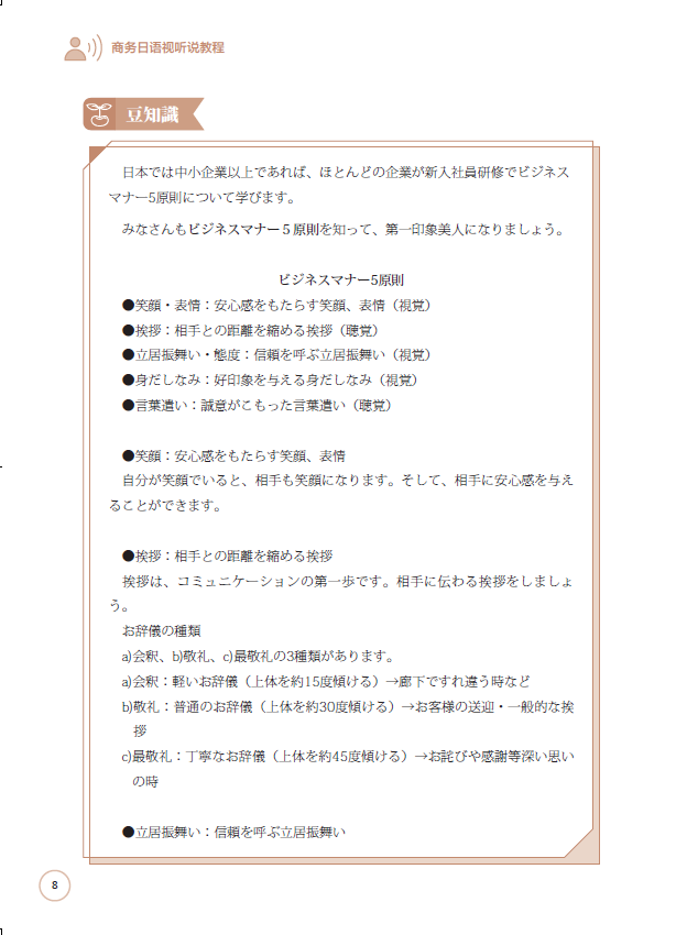 《商务日语视听说教程》是面向高职高专日语专业学生的商务日语视听说教材,教材根据高职高专学生的实际情况出发,以实用为主导,以帮助学生由学校顺利过渡到职场为大前提,合理科学地编排了15课商务相关的学习内容。学完这15课,学生不仅可以对职场所需的商务礼仪、语言知识有完全的了解,也能在正式迈入社会、走进职场之前掌握合格日语商务人才所需的必备素质。教材配有情景视频,皆由专业人士出镜录制,可以增添学习过程的趣味,从而更好地帮助学生理解和掌握相关知识。