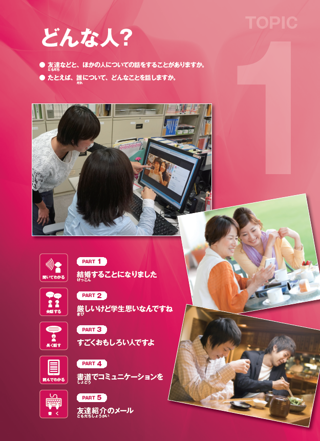 全书分为9大话题,分别为“怎样的人”“登富士山”“健康生活”“看舞台剧”“身边见闻”“想要这个”“喜欢的电影”“我城市里的交通机构”“那个年代的忍着、武士”,其中每个话题包含2课,均含有热身、听、说、读、写、拓展等学习内容,教程编排以日常常用生活场景为依托,搭配精美实景插图及形式多样的丰富练习。除此之外,本书还重视学习者对学习的自我管理,导入了自我评价环节。