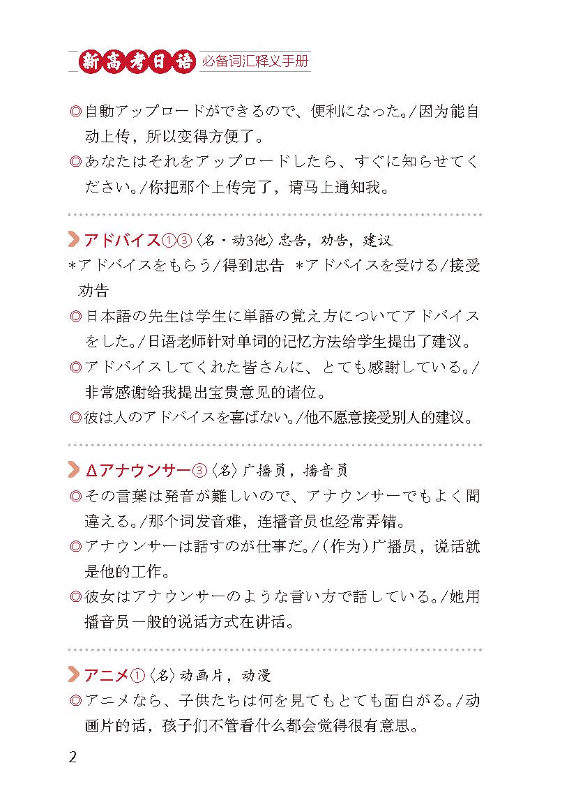 《新高考日语必备词汇释义手册》依据《义务教育日语课程标准(2022年版)》《普通高中日语课程标准(2017年版2020年修订)》编写,由教学经验丰富的高中日语一线教师和景德镇陶瓷大学外国语学院日语教师共同完成。该书内容涵盖了两部课标中的全部单词,并为每个单词配备了三至五个例句,使学习者更容易理解和掌握单词含义。内容以实用和实战为出发点,每个词条的释义和例句的配备都是按学生学习词汇和语法的先后顺序,从易到难,符合学生的心理接受能力和学识水平的逐步提升而排列,并且例句注重贴近生活,尽量避免出现课程标准以外的词汇和高考不涉及的语法,以免增加学生的学习负担。注重新颖性 该手册以词为纲,以语法为目,以典型例句再现词汇与语法的关系。通过例句可以掌握词汇和语法,这样既避免了单纯背诵词汇的枯燥,又避免了抽象学习语法的乏味,其中的典型例句学生可以记忆应用到写作文中,在学习词汇的同时,可达到举一反三,事半功倍的效果。