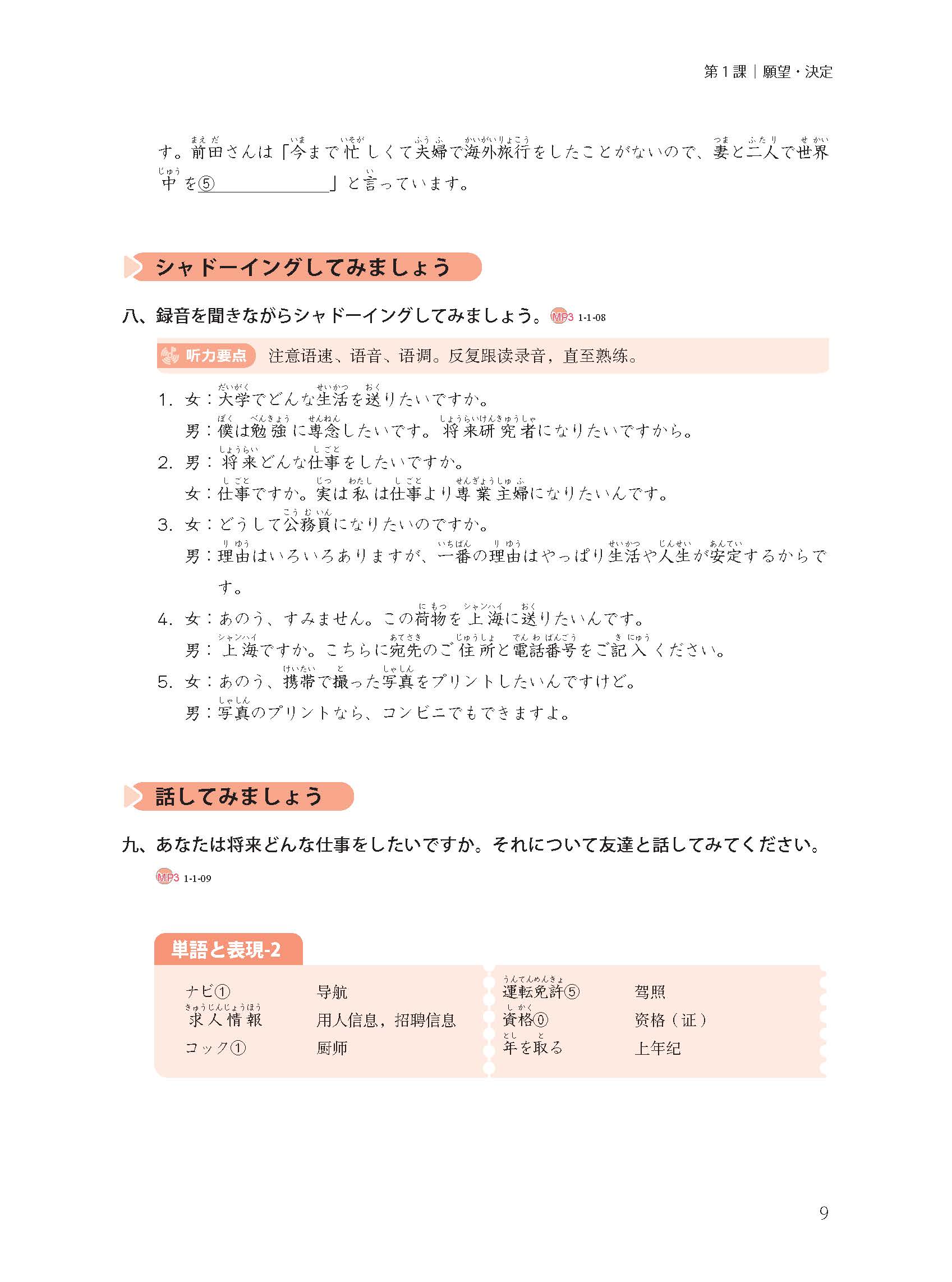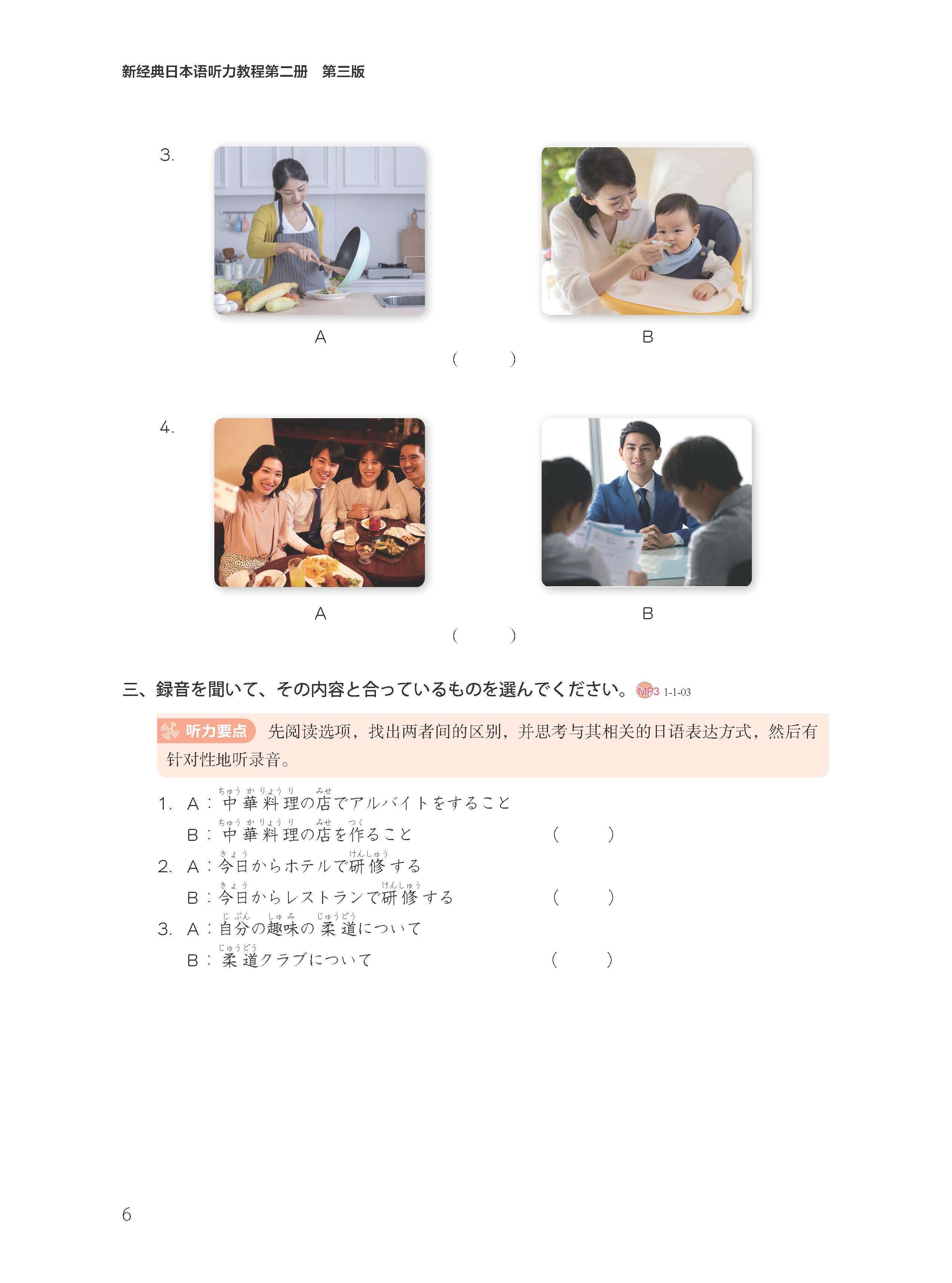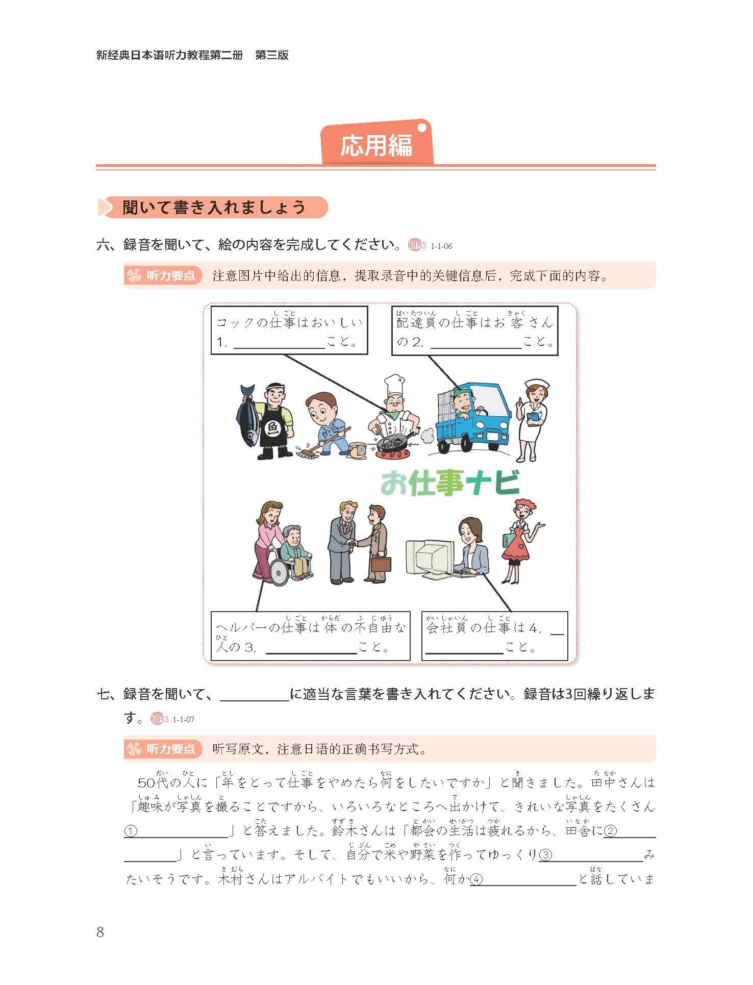 《新经典日本语听力教程第二册(第三版)》是日语专业一年级第2学期的听力课程用书,全书共16课,第1~15课每课内容分3个部分: 目标、活动1和活动2,第16课为综合测试。