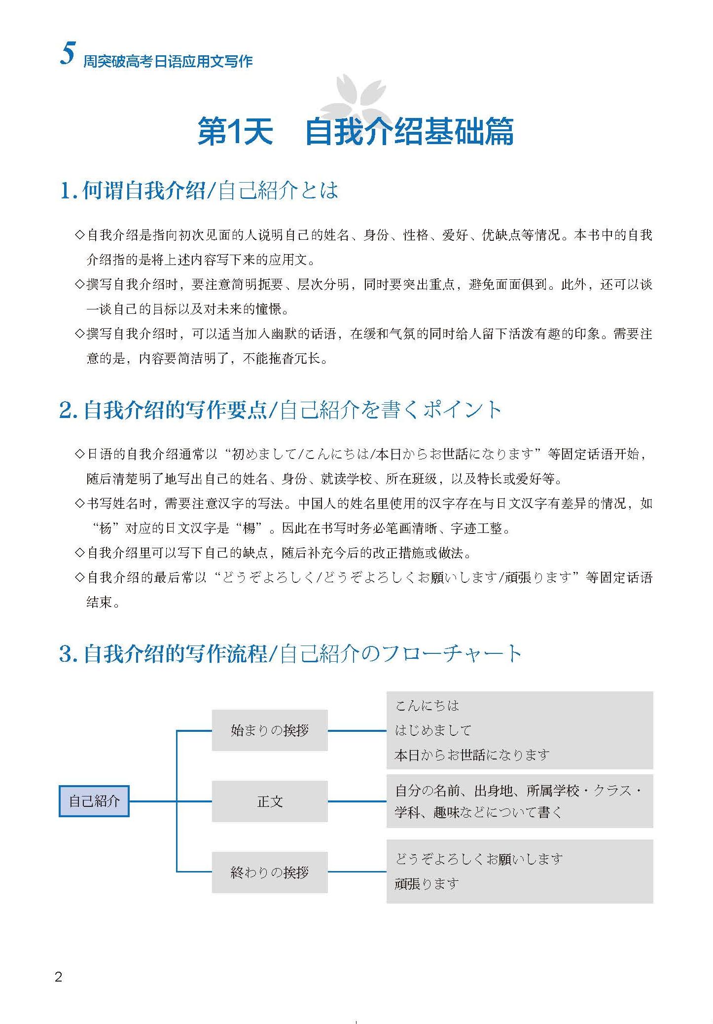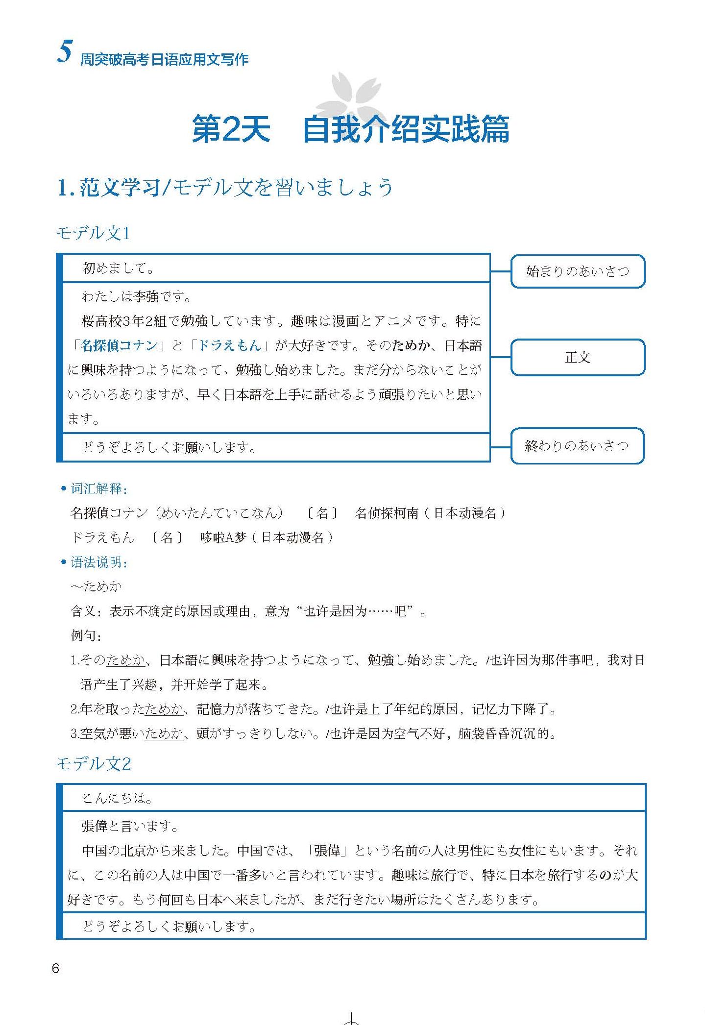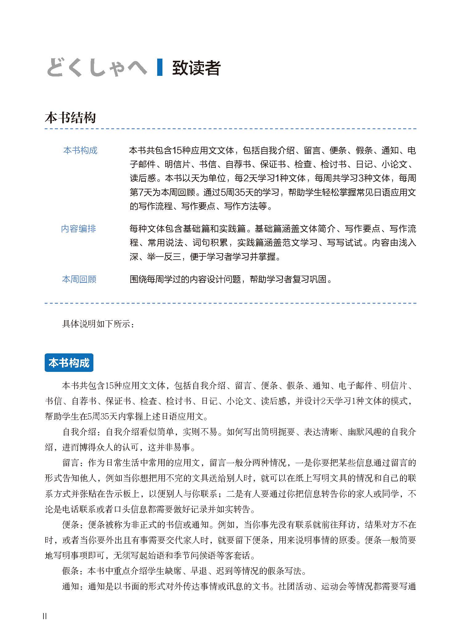 《5周突破高考日语应用文写作》精选高中阶段常见且容易被纳入出题范围的15种应用文文体,包括自我介绍、留言、便条、假条、通知、电子邮件、明信片、书信、自荐书、保证书、检查、检讨书、日记、小论文、读后感。该书在内容编排方面注重计划性,以天为单位制订学习计划,每周第1至6天共学习3种应用文文体,第7天为本周回顾。最终通过5周的学习,帮助学习者基本掌握15种应用文文体的写作要点、写作方法等。该书在内容选择方面注重实用性,以“与中学生相关”“与校园生活相关”的应用文文体作为学习内容,列举的范文难度较低且实用,适用于中学阶段的日语学习者学习使用。同时补充了应用文文体的常识性知识、写作要点、写作流程、参考词句等,以帮助学习者快速掌握各类应用文文体。