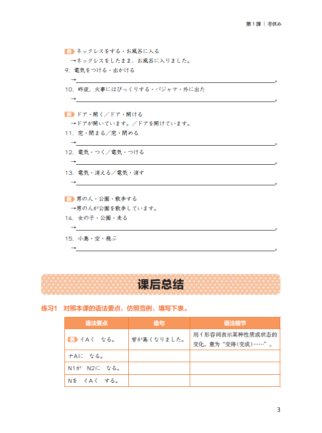 本书包含16课,每课分为“课前预习”“课后总结”“自我检测”三部分,在帮助学生打好语言基础、提高语言的应用能力的同时,培养学生的自主学习能力。”新经典日本语”系列教材依据《外国语言文学类教学质量国家标准》和《JF日语教育标准2010》,并结合外语教学的最新发展理念设计编写而成。在认真研究《高等学校本科外国语言文学类专业教学指南》内容的基础上,结合全国高校日语教师的使用反馈,总结十年来教材编写与使用经验,融入新的教学理念与教学方法,第三版教材对现有教材进行了修订。