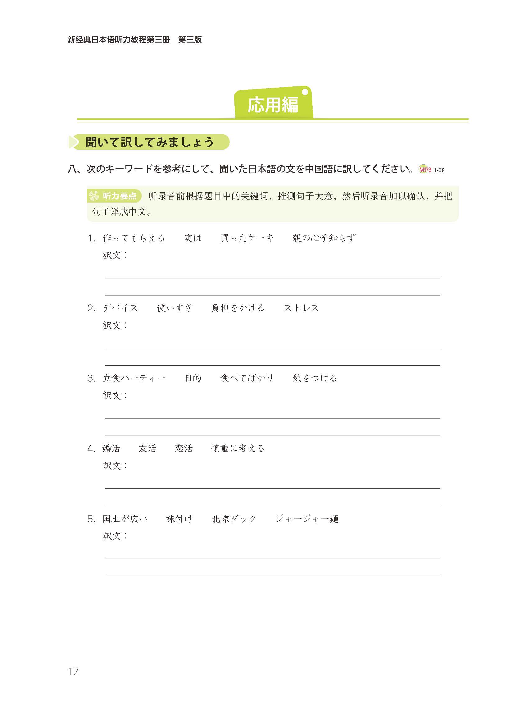 《新经典日本语听力教程第三册(第三版)》是日语专业二年级第1学期的听力课程用书,全书共16课,第1课~第15课主要为话题型听力专项训练,第16课为综合测试。