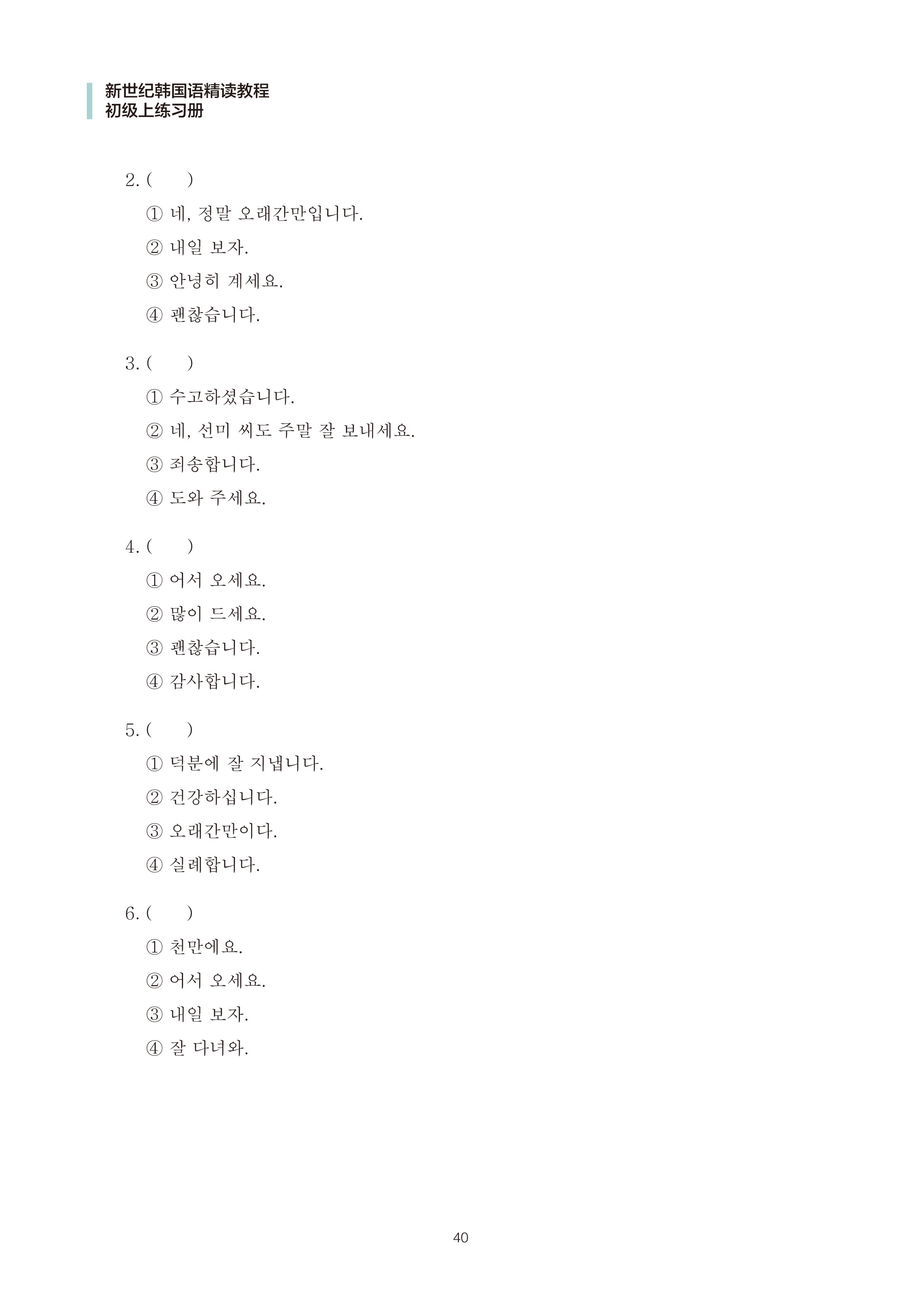 《新世纪韩国语精读教程初级上练习册》属于新世纪韩国语系列教程系列丛书,是《新世纪韩国语精读教程初级上》的配套同步练习册。和主教材一样,练习册共15课,从语音部分开始练习,是主教材的重要补充。为了便于学习者检验学习成果,还在最后收录了两套试卷。学习者通过练习册可以轻松地巩固主教材所学的词汇、表达方式和语法。练习册重点关注学习者在现实生活中可能用到的主题和技能,因而内容编排包含了大量各式各样的练习,有助于稳步提高学习者的学习水平。