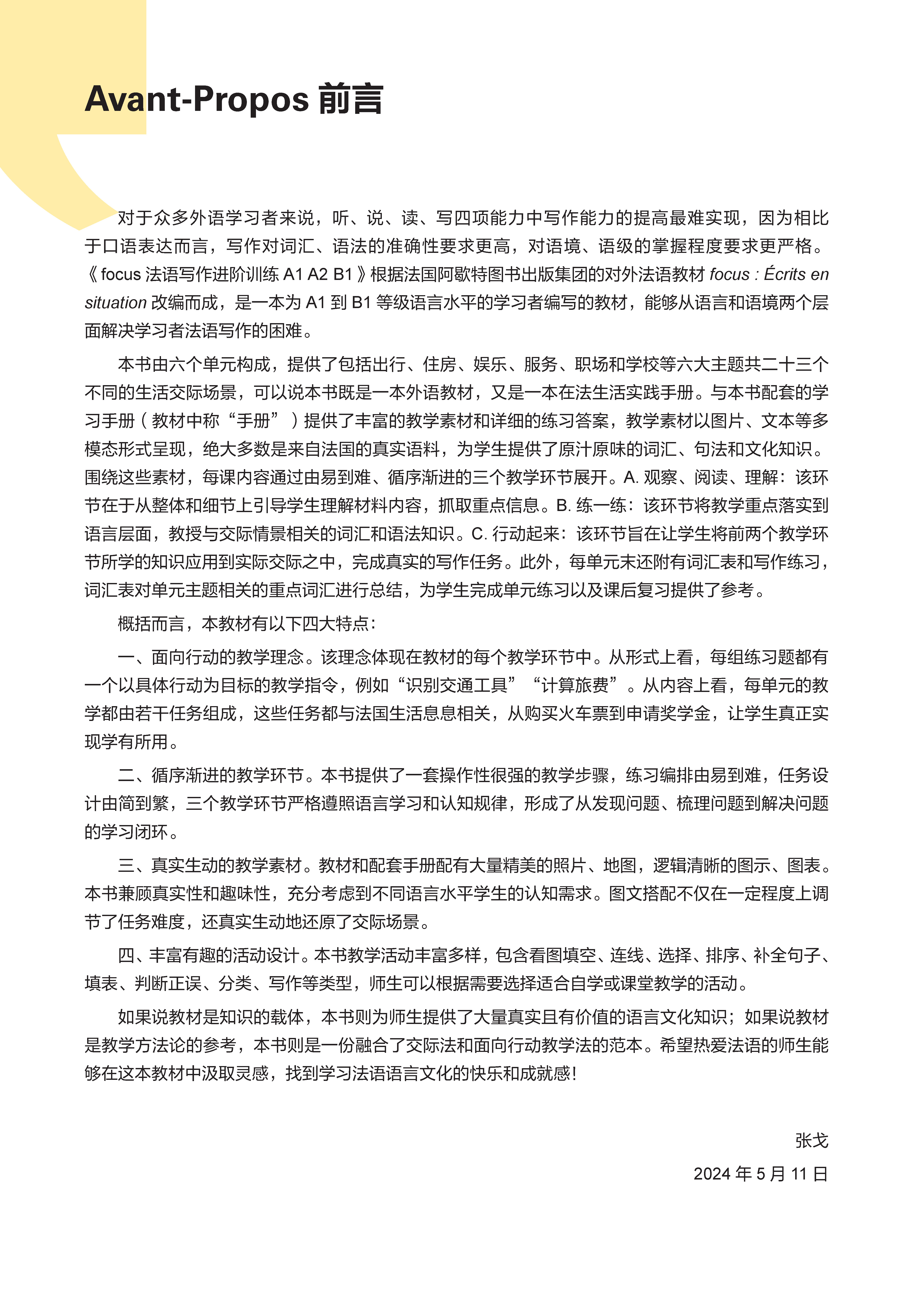 focus法语写作进阶训练A1 A2 B1》是一本面向A1~B1级别法语学习者的写作训练手册,根据法国阿歇特出版社Focus : Écrits en situation改编而成。全书共包含交通、住宿、娱乐、服务、就业、学校等6个主题单元,涵盖日常生活的方方面面;每单元包含2~5课,对单元主题进行场景细分训练。每课包括“观察、阅读、理解”“练一练”和“行动起来”三个板块,通过主题引入、阅读资料、掌握词汇和输出练习,为学生提供了基于真实生活场景的法语写作渐进训练,帮助学生掌握不同主题下的常用表达和写作技巧,提升学生的书面表达能力。此外,每单元末附有生词表和写作练习,能够帮助学生进一步巩固学习成果。本书配套音视频均放置在“外研社法语”APP上,方便学习者利用碎片化时间训练。