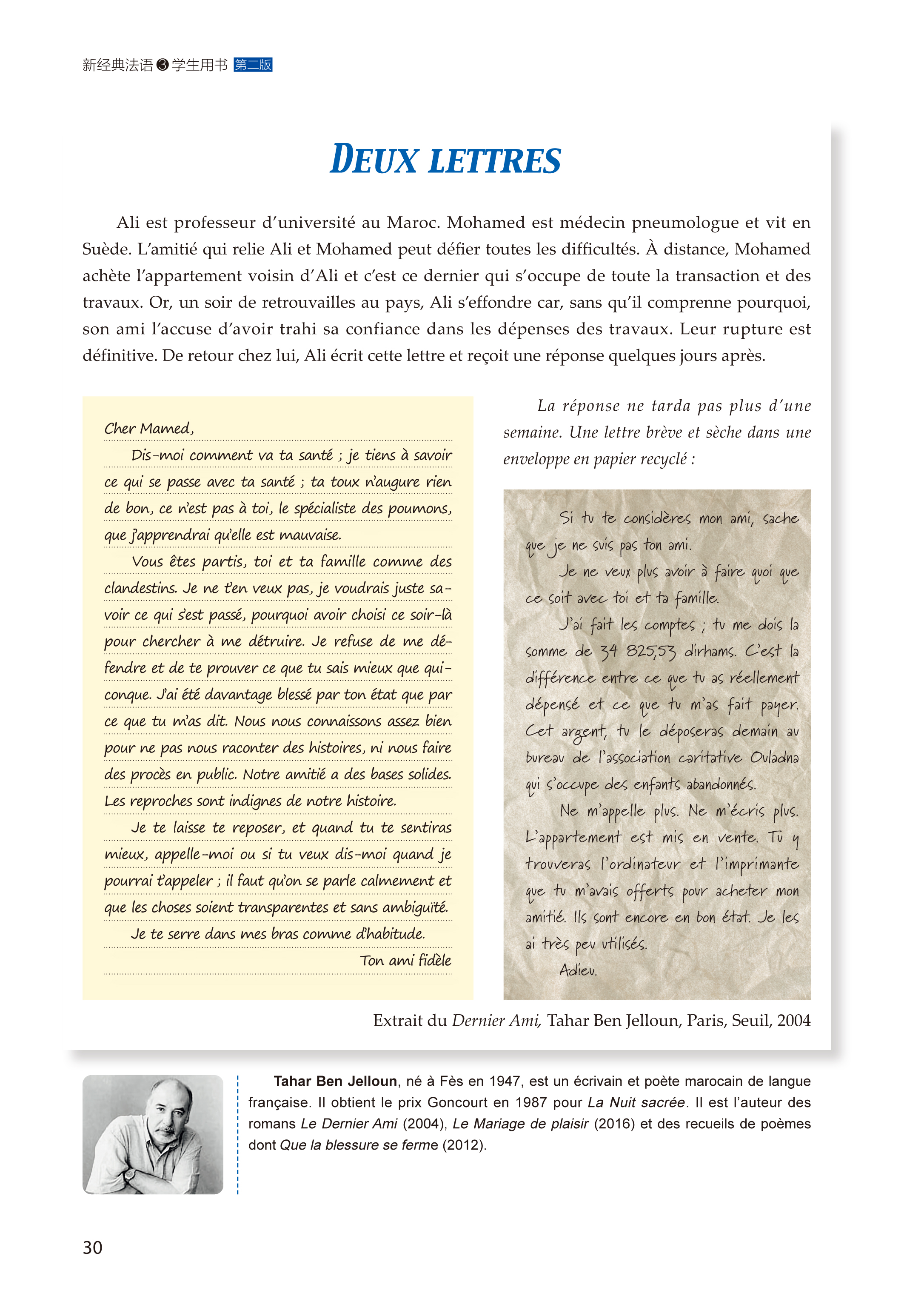 相较于第一版而言,《新经典法语3学生用书(第二版)》在延续上述特色的同时,与时俱进、更新内容,并在收集全国多所使用院校反馈意见的基础上,调整了部分知识点的引入和练习题的顺序,使之更加符合教学规律。再者,编者对第一版教材的内容进行合理瘦身,难度也更加平易近人,增强学生的获得感和成就感。