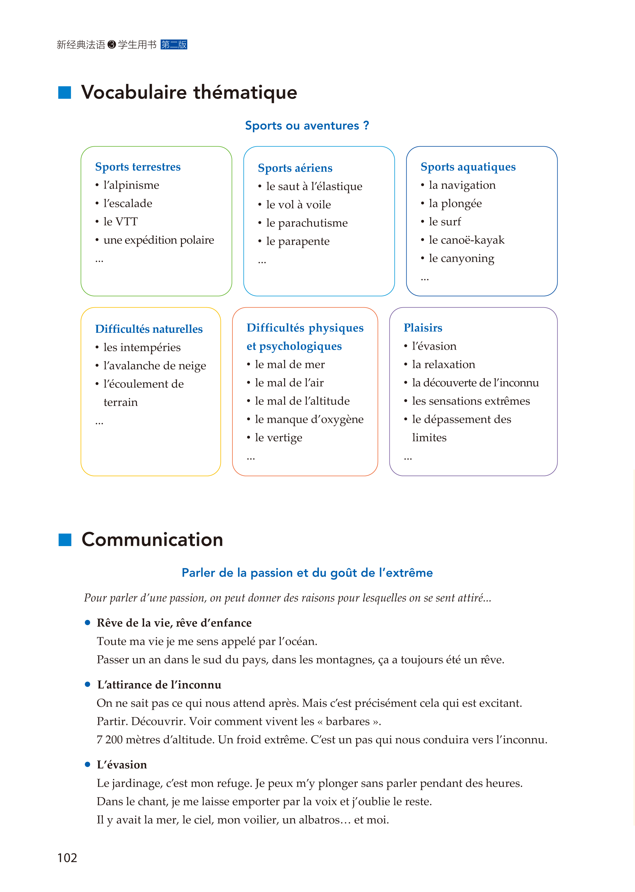 《新经典法语3学生用书(第二版)》适用于法语专业本科二年级上的学生,包含4个单元,每单元3课,共计12课。本书兼顾语言基本功训练和交际能力的培养,除了传统的语言知识讲解外,还特别设置了“主题词汇”“交际”“文化阅读”三大板块,为学生学习语言知识、了解对象国文化并灵活运用语言提供切实有效的指导。此外,本书的课文、例句、练习等均选自文学作品、报刊、电视、网络等渠道,确保学习者学到的即是母语者使用的语言。不仅如此,课文还具有极强的可读性和趣味性,涉及文学、时尚、美食等诸多领域。