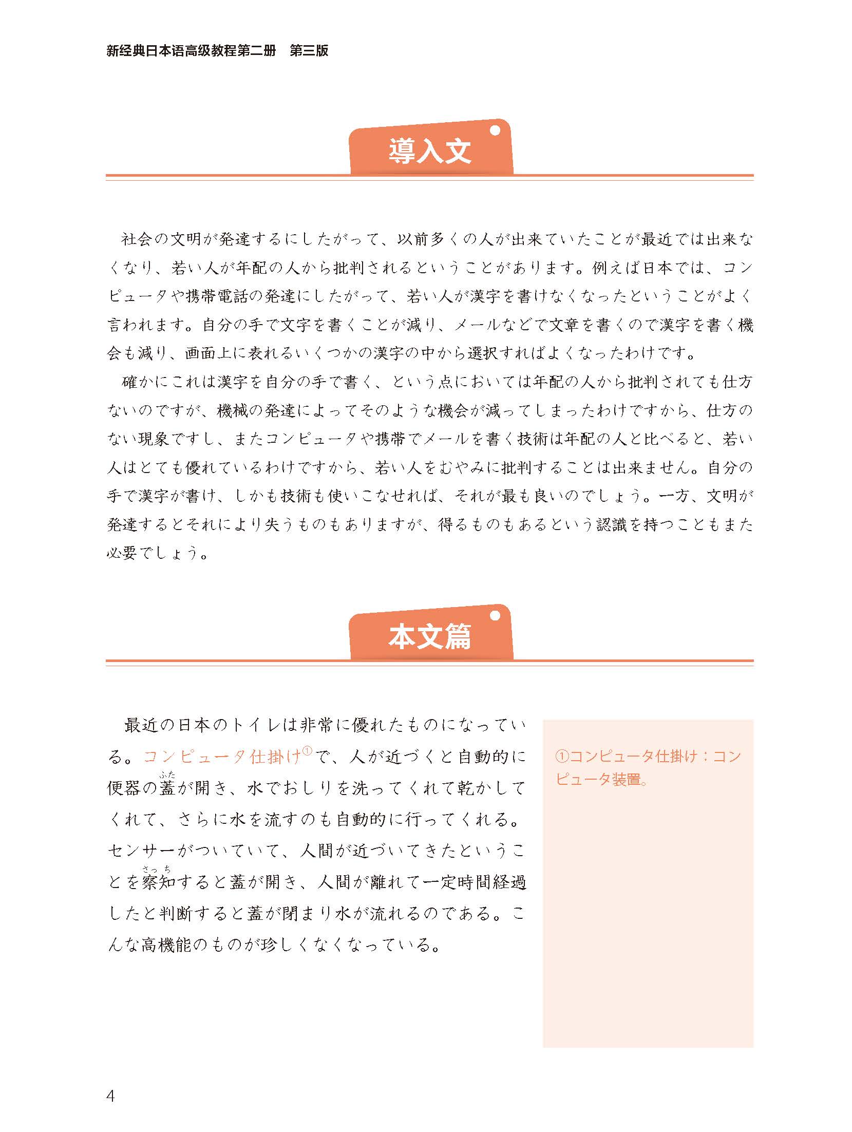 《新经典日本语高级教程第二册(第三版)》是以日语专业三年级学生为对象,以培养学生听、说、读、写、译等综合语言运用能力为目标的教材。《新经典日本语高级教程 第三版》在教学理念和教学模式的探索与创新上做了大胆尝试。在编写设计中,主要体现了以下几个特点:打破传统的模式,以学生为中心,培养学生自主学习意识。以输出为驱动,以任务型教学法为手段,培养学生的综合应用能力。在语言学习中融入文化元素,培养学生的跨文化交际能力和思辨能力。注重文章素材的知识性和趣味性。提供“教、学、测、评”完整的教学服务解决方案。