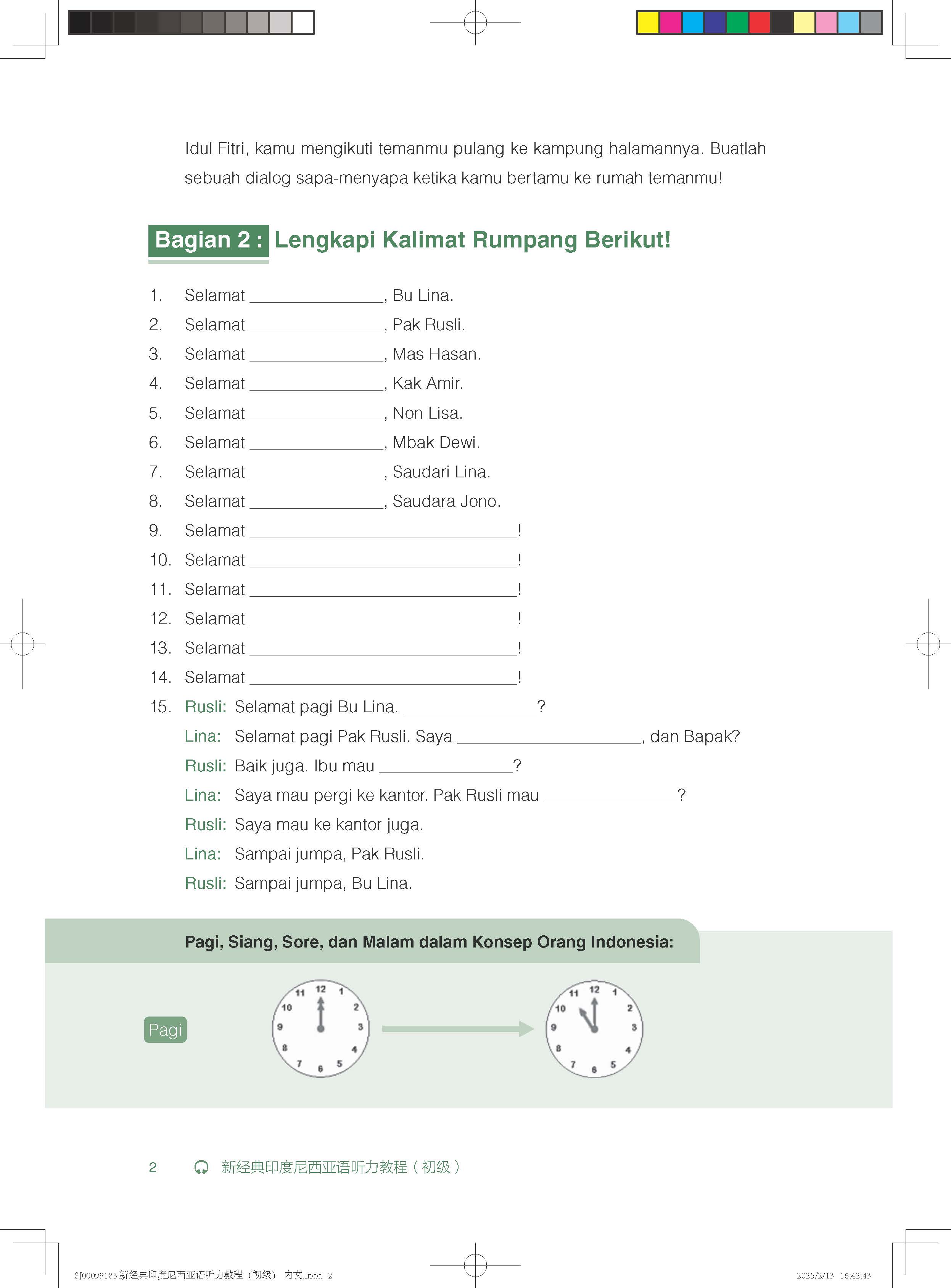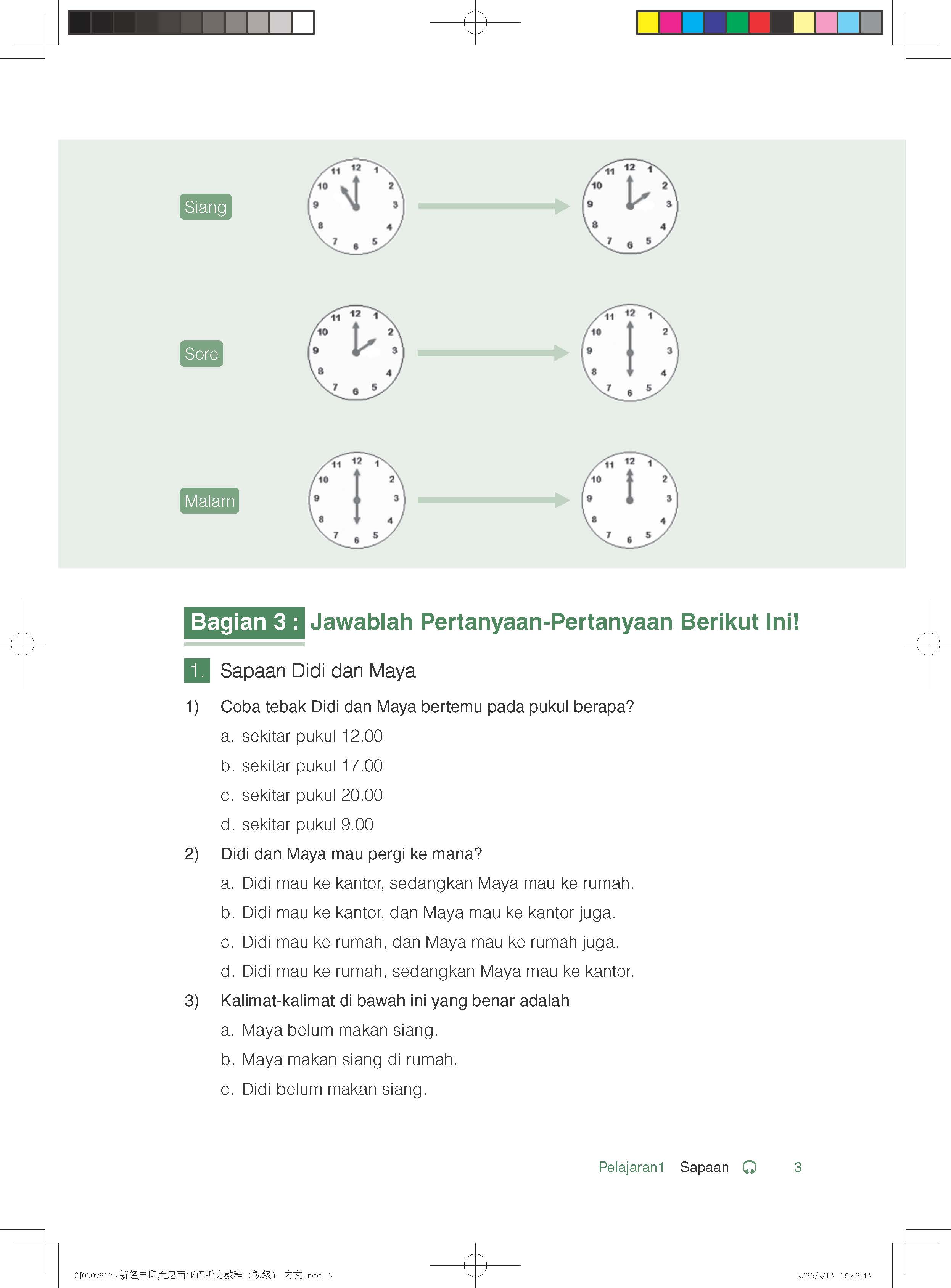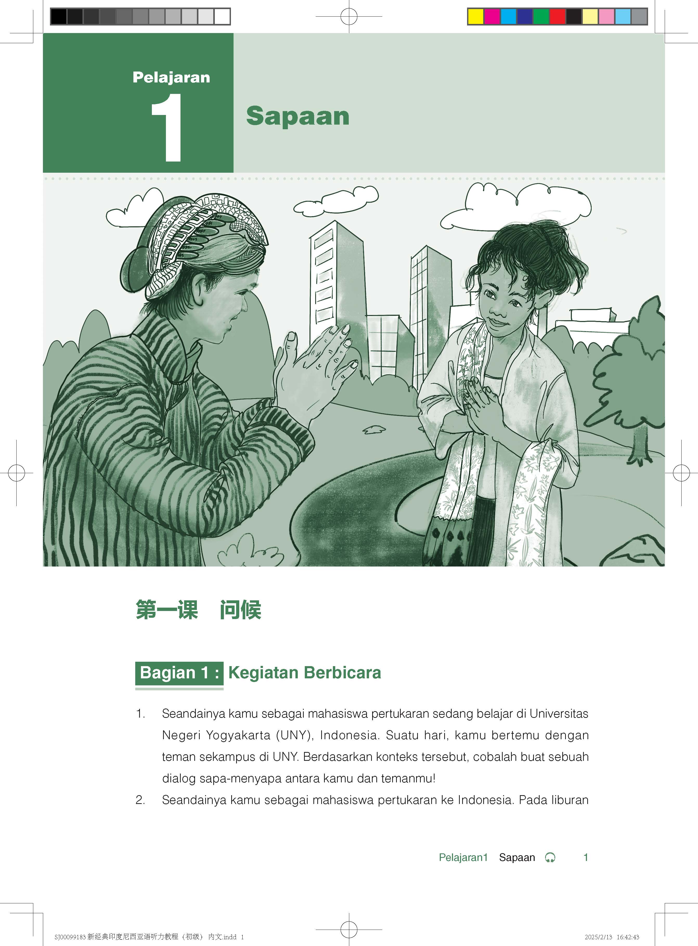 《新经典印度尼西亚语听力教程》(初级)包含16课,主题和场景紧密围绕学生在印尼的学习与生活,内容覆盖日常问候、建立友谊、发出邀请、提出询问、表达情感、处理留学事宜、校园日常、就医、理发、购物、餐饮、旅游以及交通等多个实用领域。教材内容设计遵循产出导向法的理念:第一部分为口语活动,旨在通过具体的口语产出任务激发学生主动学习和发现知识与语言技能的不足,教师可根据教学需要布置课前作业。第二和第三部分通过逐步深入的语篇和配套练习,促进学生对主题知识和语言技能的掌握。在教学实践中,教师应鼓励学生进行自我评价,并引导他们参与师生共评,以便查漏补缺。第四和第五部分围绕单元主题,补充语言技能和相关文化知识,教师可根据课时安排进行讲解和扩展。第六部分为口语输出作业,鼓励学生在中国文化背景下尝试用印尼语输出相关主题语篇,通过文化比较培养跨文化交际能力,并为学生用印尼语讲述中国故事打下基础。