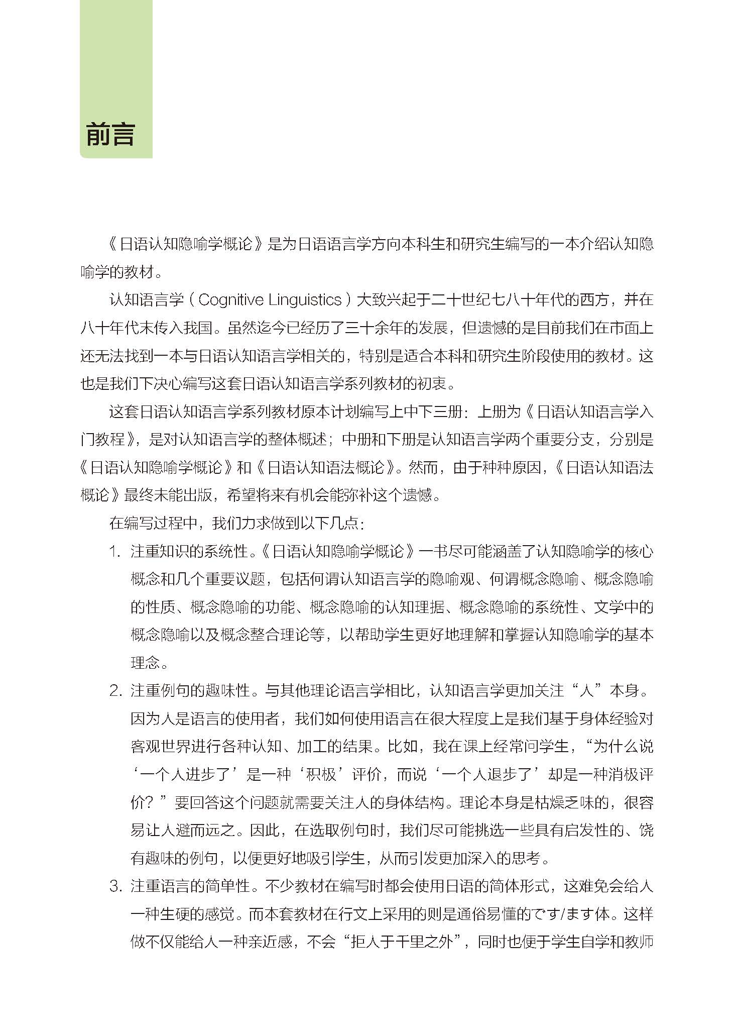 《日语认知隐喻学概论》适用的课程包括大学日语专业三年级或四年级的专业选修课(专业方向课)或面向研究生一年级开设的语言专业类课程。本教材注重知识的系统性,涵盖认知隐喻学的核心概念和几个重要议题,以帮助学生更好地理解和掌握认知隐喻学的基本理念;注重例句的趣味性,尽可能挑选一些具有启发性且饶有趣味的例句,从而引发更加深入的思考;注重语言的易读性,在行文上采用通俗易懂的です/ます体,便于学生自学和教师直接用日语授课。