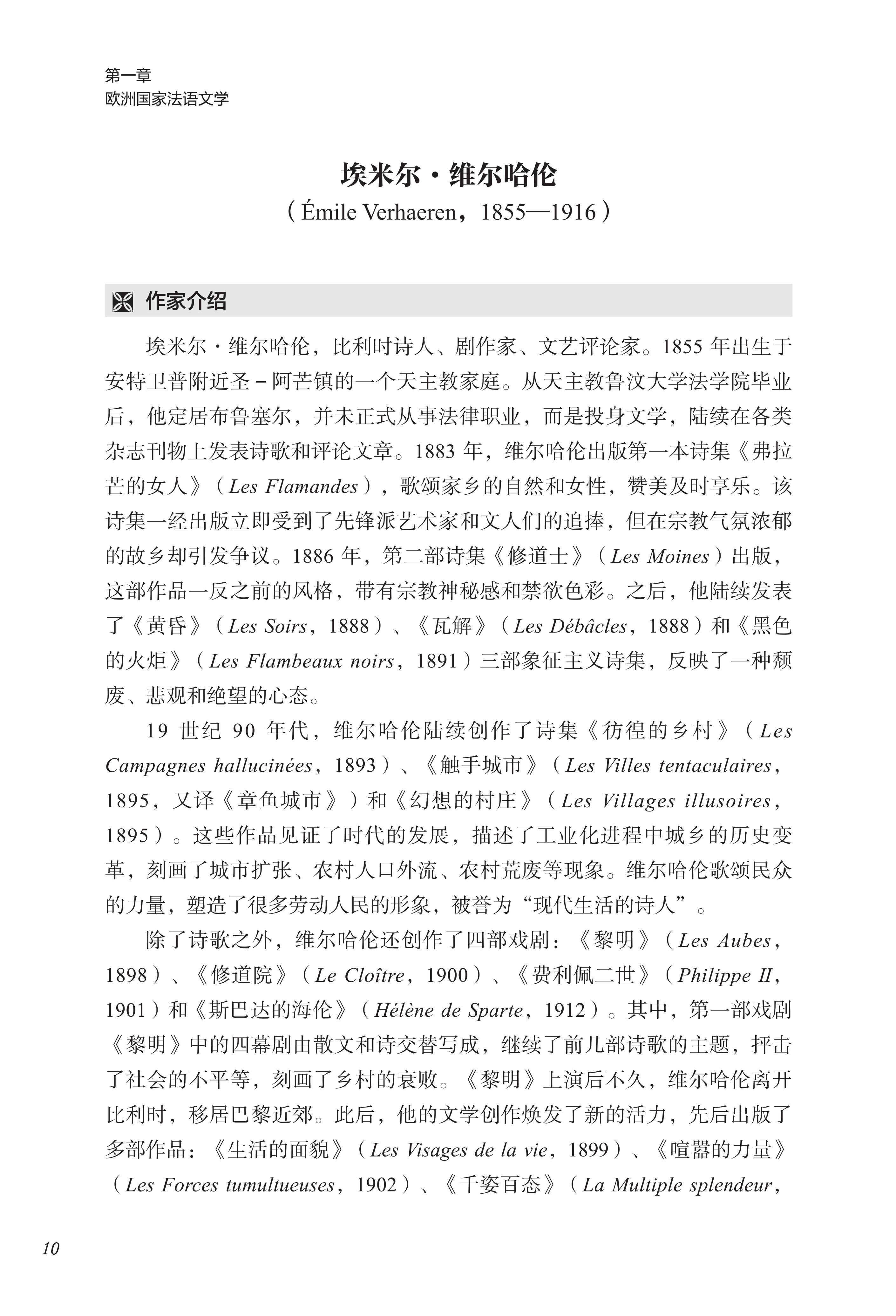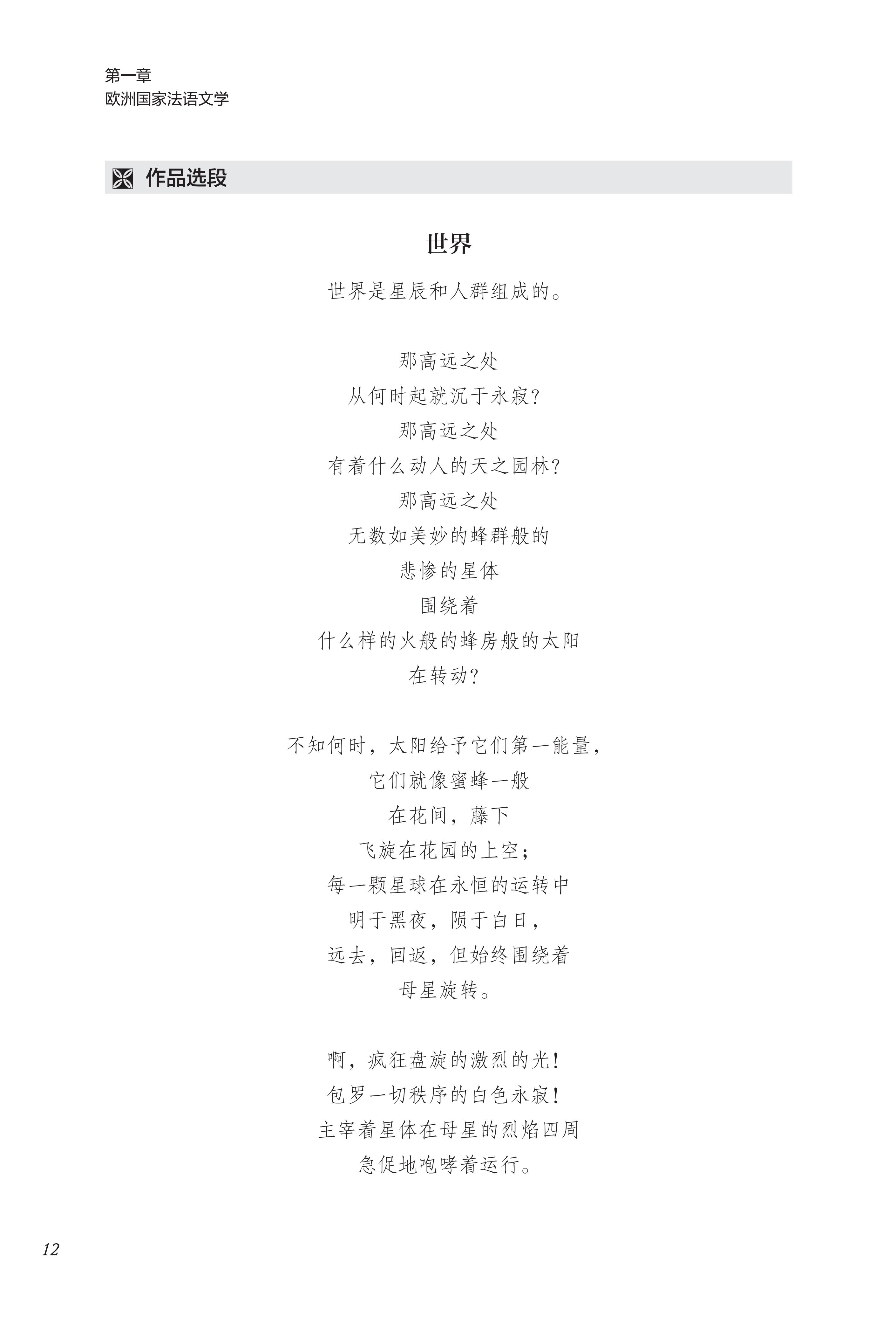 《法语世界文学》选择欧洲法语国家(比利时、瑞士、中东欧国家)、美洲法语国家与地区(加拿大魁北克、加勒比海地区国家)、非洲法语国家(北非、撒哈拉以南法语国家)、亚洲与太平洋法语国家与地区(黎巴嫩、东南亚国家、新喀里多尼亚)的法语文学中的经典作家及经典作品,按照地理区域划分章节,对法语国家与地区的法语文学的全貌、代表作家、代表作品进行以点带面的介绍,凸显出不同作家受时代背景及个人经验影响做出的不同的文学选择,及作品呈现出的各异特质,全方位地呈现出作为世界文学重要组成部分的法语文学创作风貌,并展现了法语文学突破中心主义走向世界的发展趋势。本书法语部分上线至外研社法语APP,方便读者对照阅读。