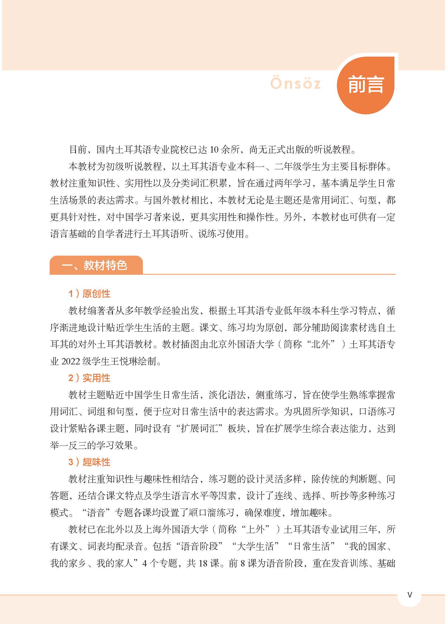 《新经典土耳其语听说教程1》为初级土耳其语听说教程,主要面向土耳其语专业本科一、二年级学生。教材突出知识性与实用性,注重分类词汇的积累,旨在通过系统学习,使学生在两年内基本掌握日常生活场景中的土耳其语表达能力。与国外原版教材相比,本教材在主题选择、常用词汇和句型设计上更贴合中国学习者的实际需求,针对性强,便于课堂操作与课后自学。同时,教材也适用于具备一定语言基础的自学者,帮助其系统提升土耳其语的听说水平。