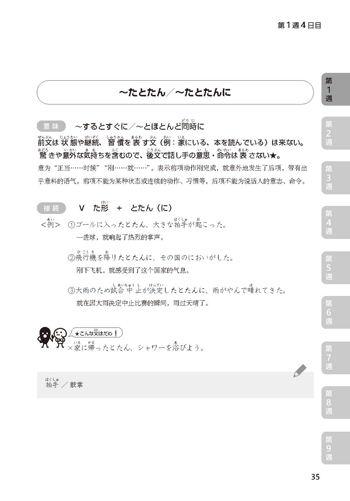 《新日语能力考试对策语法N2》以掌握新日语能力考试N2级别中出现的语法条目为练习目的,适用于想通过新日语能力考试N2级别的学习者及想赴日工作的学习者。本书既可作为N2语法的备考用书,也可作为提高自身实际语言运用能力的辅助材料和检测材料,帮助学习者全面综合提升日语语言技能。本书依据N2级别的语法总量,对结构、意义类似的语法进行归类,并将任务细化到每一天。各部分的结构为“讲解—测试”,每天的学习量为3—5页,分配合理,可以帮助考生有规划地进行复习。