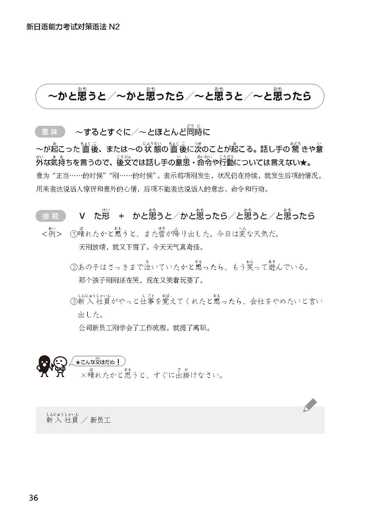 《新日语能力考试对策语法N2》以掌握新日语能力考试N2级别中出现的语法条目为练习目的,适用于想通过新日语能力考试N2级别的学习者及想赴日工作的学习者。本书既可作为N2语法的备考用书,也可作为提高自身实际语言运用能力的辅助材料和检测材料,帮助学习者全面综合提升日语语言技能。本书依据N2级别的语法总量,对结构、意义类似的语法进行归类,并将任务细化到每一天。各部分的结构为“讲解—测试”,每天的学习量为3—5页,分配合理,可以帮助考生有规划地进行复习。