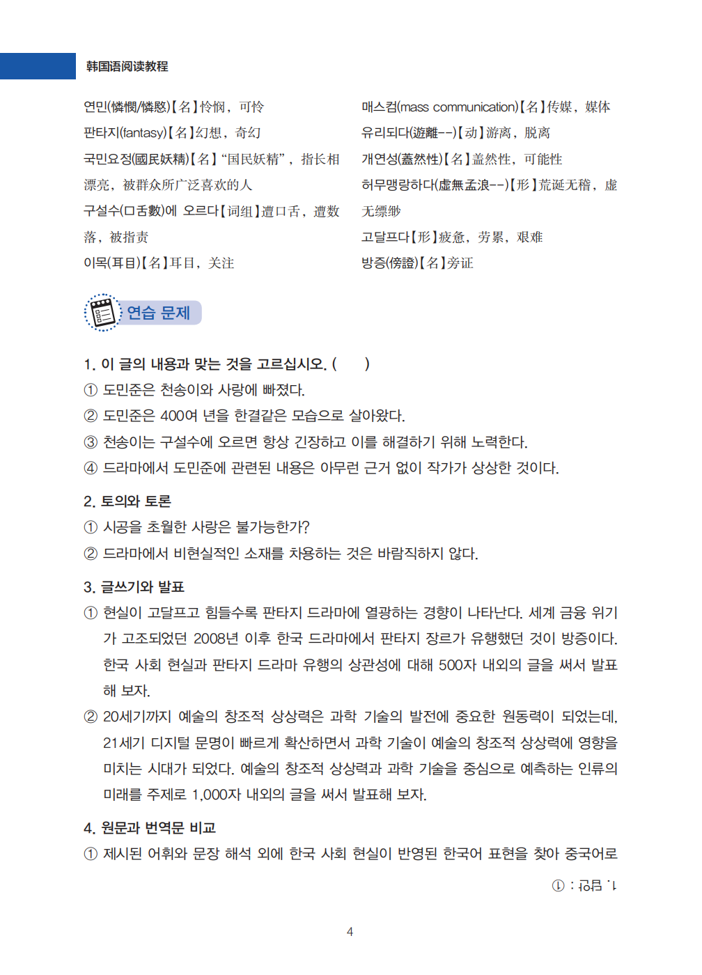 《韩国语阅读教程-通过电视剧学习韩国语和韩国文化》包括30部韩国国内极具人气的电视剧,内容涉及韩国社会的方方面面,无论视角观点,还是人物对话、背景设置都具有不同时期强烈的时代特色。30篇阅读文本能够引领学生博古通今,对韩国的历史、经济、文化等领域有一个综合性的了解。高质量的阅读文本和有针对性的阅读练习能够使学生快速且高效地提高阅读实力,游刃有余地应对韩国语能力考试。本教材共15课,每课包括两篇电视剧阅读文本,每篇文本下方附有词汇和练习。通过学习这本教材,学生可以切实提高阅读能力,积累大量阅读及解题技巧;可以通过译文对照提高翻译能力,并储备丰富的中高级词汇;可以对韩国的历史、社会、文化等有更直观、深入的了解,并通过评论性文章拓展批判性思维。