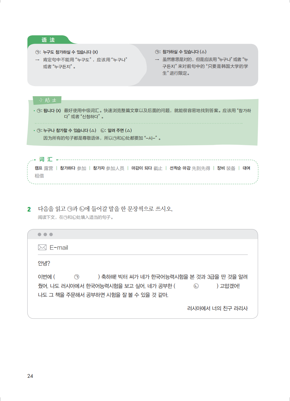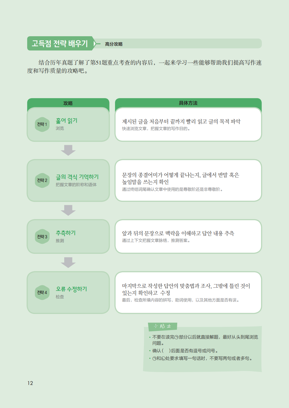 《新韩国语能力考试写作必备中高级》主要针对能考中的写作部分,也就是第51-54题进行了详细讲解。题型解析帮助考生准确理解题型,为备考指明方向。书中结合真题详细介绍了针对每一个题型的解题攻略,即便是连母语写作都不是很擅长的学生,也能通过学习攻略在能考写作部分中取得相对理想的分数。另外,书中还提供了模拟试题,让学生能够随学随练,通过实战更加准确地把握题型,更加扎实地掌握解题技巧。错误使用阶称和语体是写作中经常出现的错误,书中按照题材类型对正确的阶称和语体的用方法进行了详细的说明,并归纳出了比较典型的、常见的错误。除此之外,书中的名师写作技巧板块对写作中常用的近义词、反义词、典型句型,以及同一种含义的多种表达方式都进行了分类总结,从多个角度帮助考生提高写作能力。