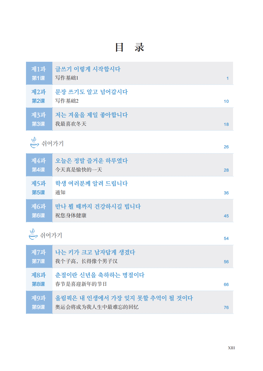 《新世纪韩国语写作教程初级》是“新世纪韩国语写作系列教程”的第一册,适用于韩国语专业写作课程,使用对象为至少已学习半年(一学期)韩国语的学生。本教材共15课,第1课和第2课主要介绍了隔写法、稿纸格式、标点符号和校对符号等写作规范,并讲解了文章类型、句子成分和书面语特点等基础知识。 第3课至第15课根据写作学习各阶段的特点,设置了不同写作体裁的训练目标,每课设置了“范文学习”“思考训练”“课后练习”和“模仿写作”等主要模块。