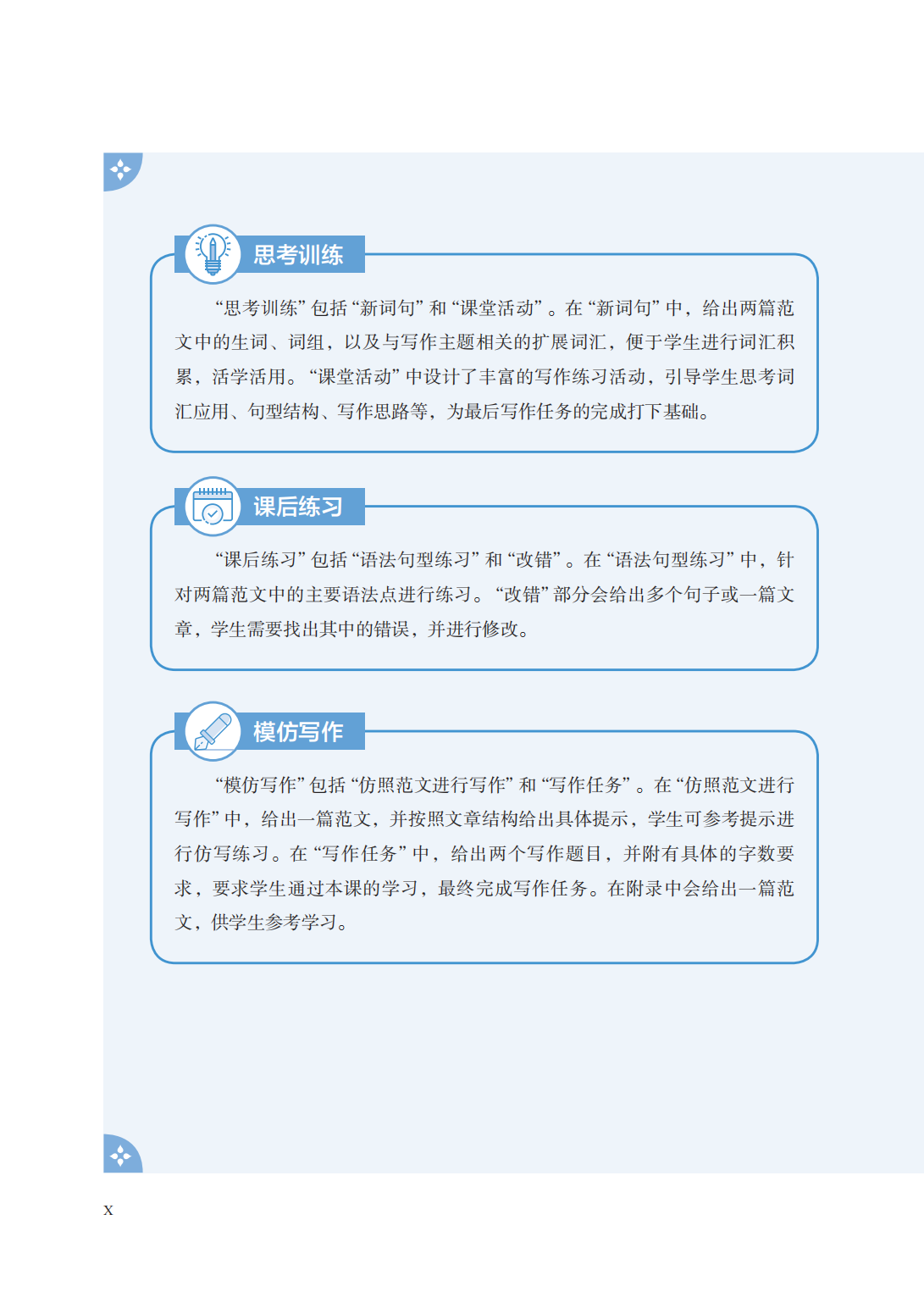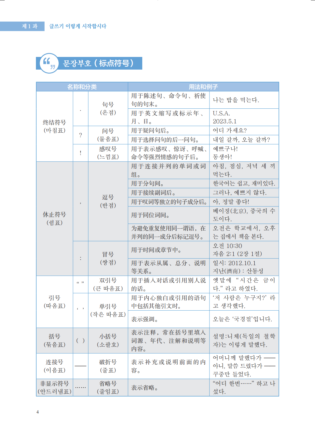 《新世纪韩国语写作教程初级》是“新世纪韩国语写作系列教程”的第一册,适用于韩国语专业写作课程,使用对象为至少已学习半年(一学期)韩国语的学生。本教材共15课,第1课和第2课主要介绍了隔写法、稿纸格式、标点符号和校对符号等写作规范,并讲解了文章类型、句子成分和书面语特点等基础知识。 第3课至第15课根据写作学习各阶段的特点,设置了不同写作体裁的训练目标,每课设置了“范文学习”“思考训练”“课后练习”和“模仿写作”等主要模块。
