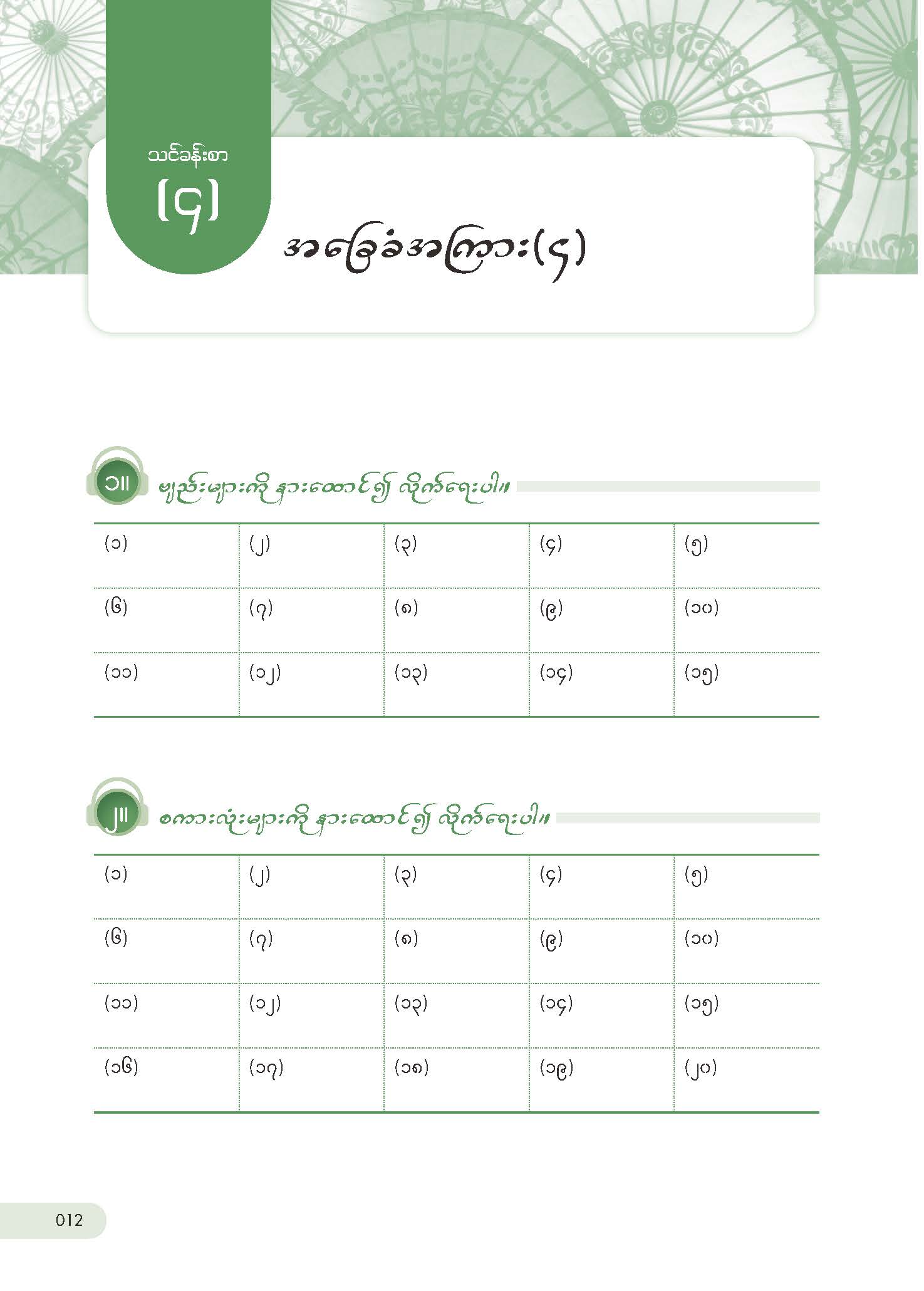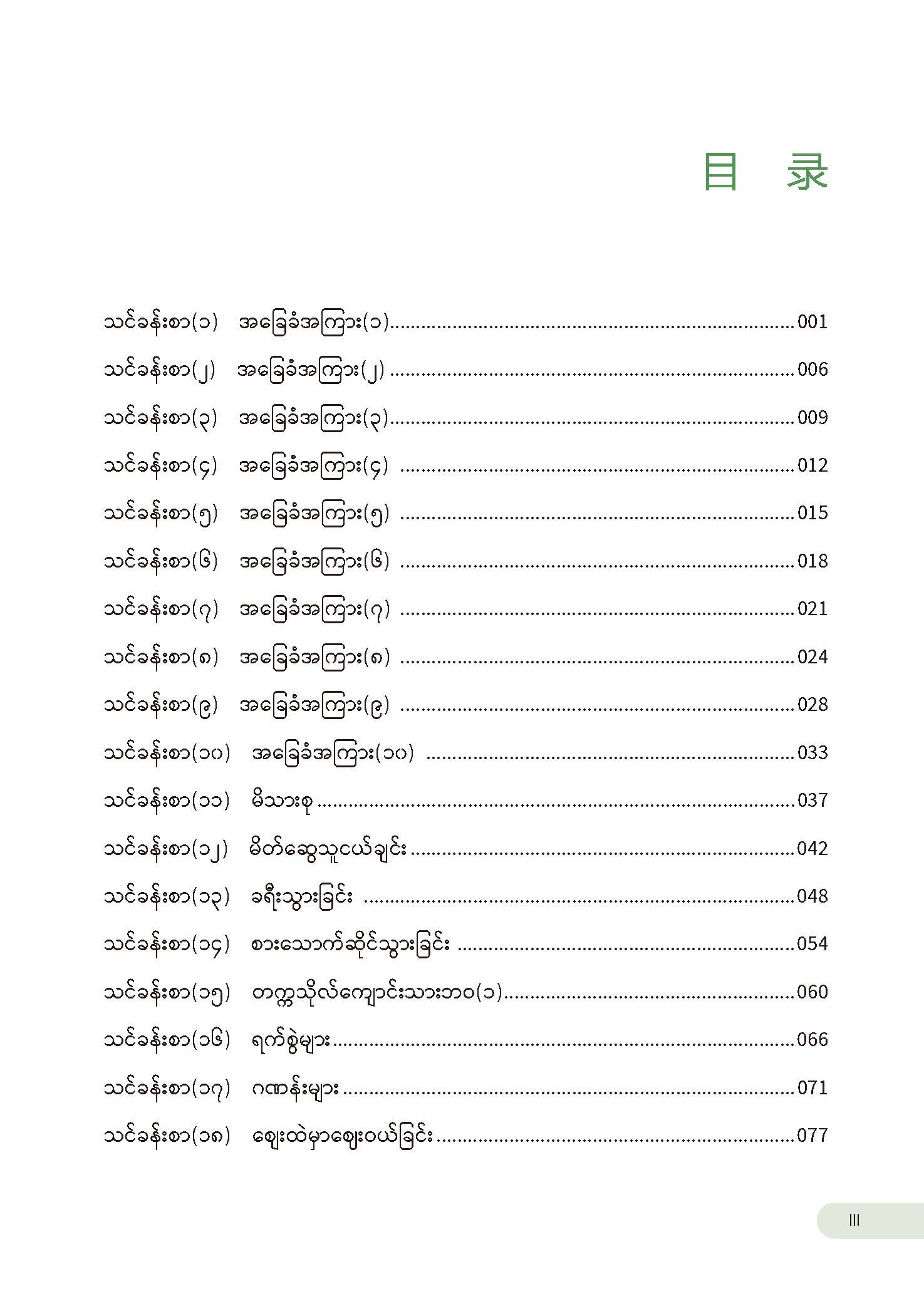 本书共30课,分为基础语言部分(第1至10课)和专题部分(第11至30课)两大板块。基础语音部分侧重于缅甸语中基本语音的辨识,帮助学习者熟练掌握拼音规则;专题部分则设有明确的学习主题,包括家庭、朋友、购物、餐饮、交通、生活、旅游、节庆、时尚、日期与数字等内容,通过生动的场景来帮助学习者逐步提升听力水平。