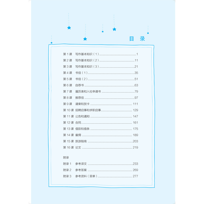 本教材的16 课内容已构成一个完整的写作体系,如果再配以其他教材,辅以基础写作训练,加上灵活多样的教