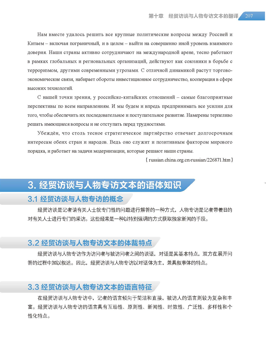 创新性:传统理论和创新理念相结合,在传统的俄语翻译理论与技巧基础上,分析经贸领域中各种文本类型内容新颖的实例语料的结构与特点,探讨不同语篇单位的翻译,总结经贸文本翻译的实践技巧;