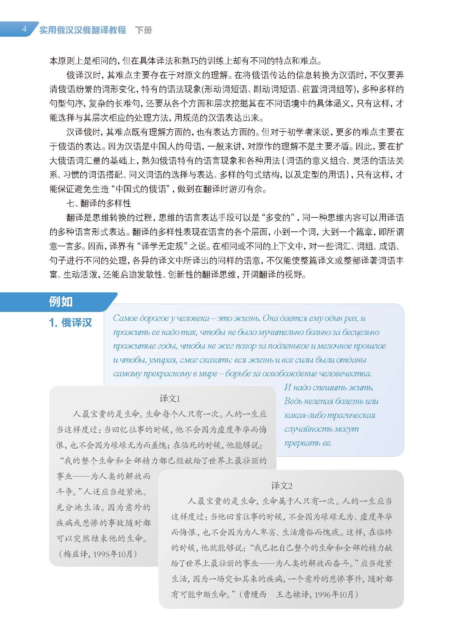 《实用俄汉汉俄翻译教程下册第3版》为高等院校俄语专业翻译课程教材,也可作为俄语专科班及培训班的翻译教材,适用于广大从事外事、经贸、导游等工作的俄语翻译工作者。下册按照语体分成37个专题单元。每个单元包括分析译例、译法提示、翻译技巧和翻译练习四个部分。第3版中不仅增添了新的语料,而且还修正了原教材中表达不准确的地方,使教材的内容更加符合教与学的需要。教材突出了翻译实践性,把翻译的基本理论贯穿在概论等部分,尽量做到以理论指导实践,以实践提升理论。