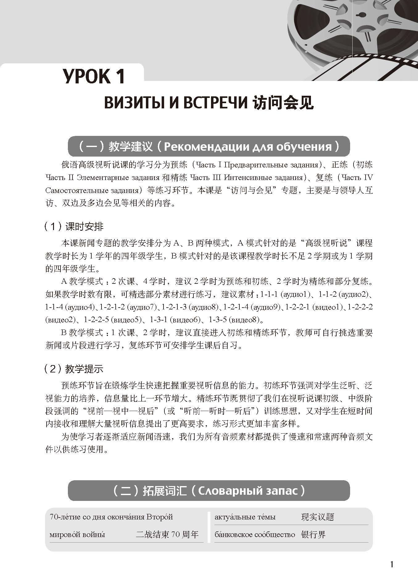 《俄语高级视听说教程教师用书》可充分满足高校俄语专业四年级两个学期视听说课的教学需要,共18课,上下学期各9课,每周2学时,每学期36学时。全部专题为:访问会见、国际时事、国内政治、事故灾害恐怖袭击、经济、科技、军事安全、社会卫生、文化体育、中国、访谈演讲等。专题设计的出发点是既要参考俄罗斯新闻报道的主流分类体系,又要考虑到实际的教学需要。素材收录内容上是点面结合,既触及新闻时事的热点问题,又照顾到话题的全面性。素材内容丰富,时代感强。练习循序渐进、形式多样。